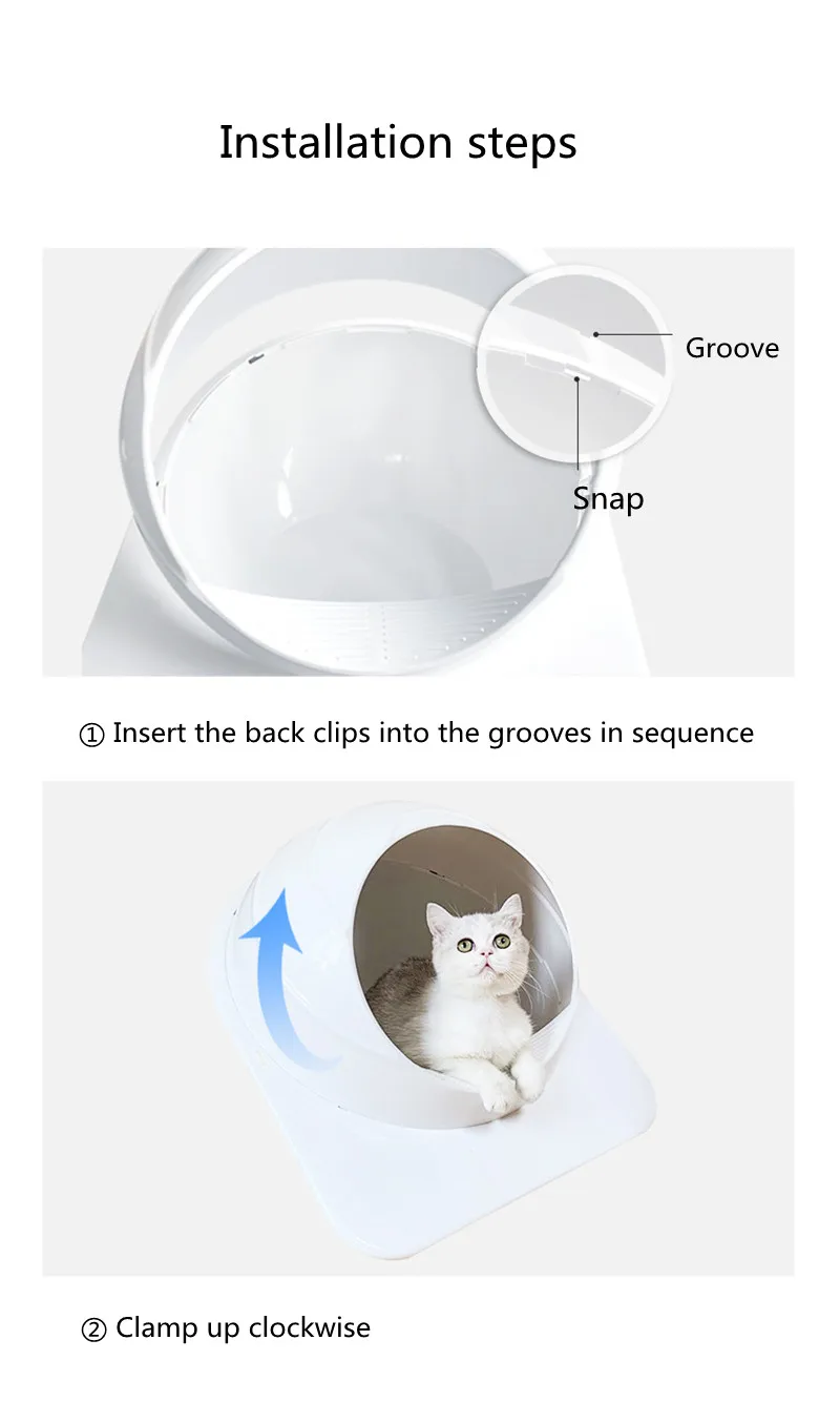 ①Новое обновление, большое пространство для размещения ② Полузакрытый дизайн для предотвращения брызг кошачьего туалета ③Встретить любимые скрытые функции питомца и создать безопасную и комфортную атмосферу ④Полное покрытие, более приятный запах ⑤Съемный дизайн, легко моется PP пищевой полипропиленовый материал, более безопасный для использования
