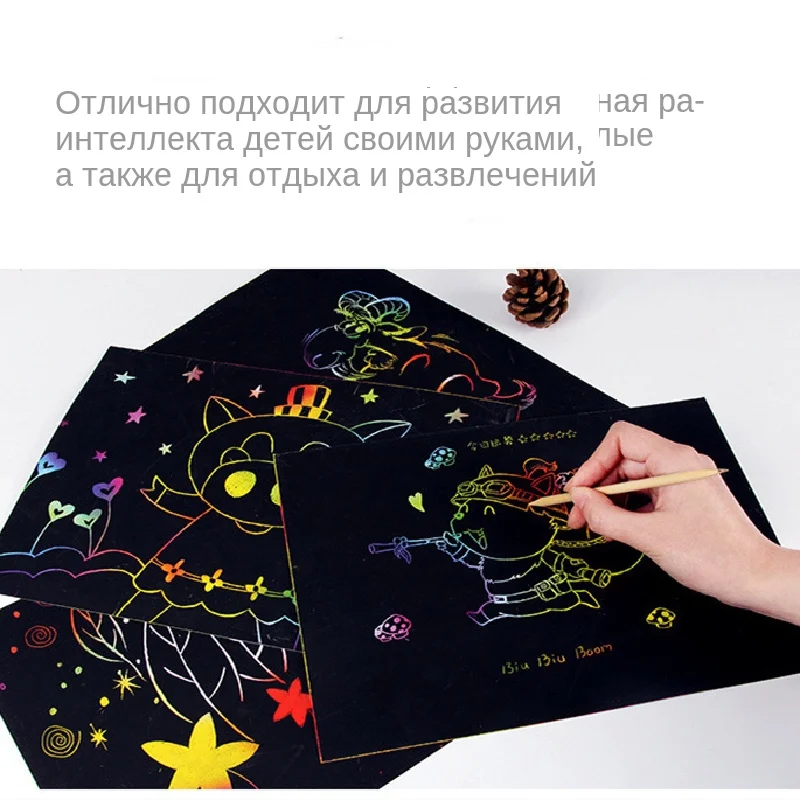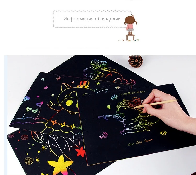 Описание: -Название продукта: волшебная доска для рисования с царапинами, блокнот, сделай сам, радужные Цветные Игрушки для рисования для детей, детские развивающие игрушки, подарки -Размер: 19x26 см -Состояние на 100% абсолютно новый и высокое качество -В каждой книге 10 страниц. Особенности: -Пустые матовые черные страницы с радугой цветов и узоров, скрытых под ними. -Просто поцарапайте черное покрытие с помощью встроенного деревянного стилуса, чтобы показать калейдоскоп цветов под ним. -Отлично подходит для детей DIY граффити, ручной рисунок, развитие интеллекта, а также для отдыха и развлечений для взрослых. -Изготовлен из бумажного материала, с защитой от царапин, с легкими, прочными и прочными характеристиками. -Pefect для doodle, jot notes, making cards, sketch, draw и т. д. -Хороший подарок для вас и ваших друзей. Посылка включает: -1 шт. книга для рисования -1 бамбуковая палочка