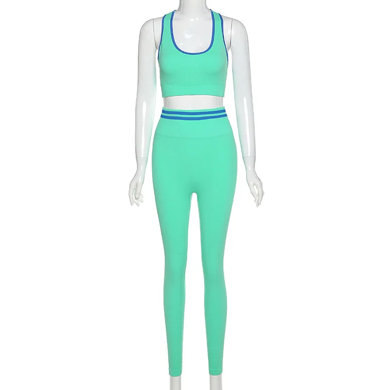 Бесшовная Спортивная одежда для фитнеса; Комплект из двух предметов; Укороченный топ без рукавов; Облегающие леггинсы с высокой талией; Бесшовные трикотажные спортивные костюмы
