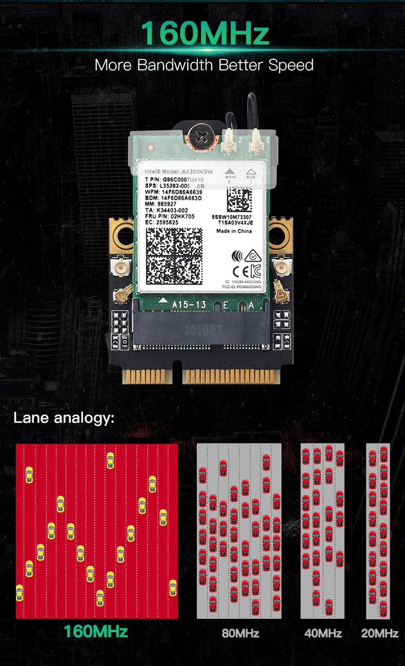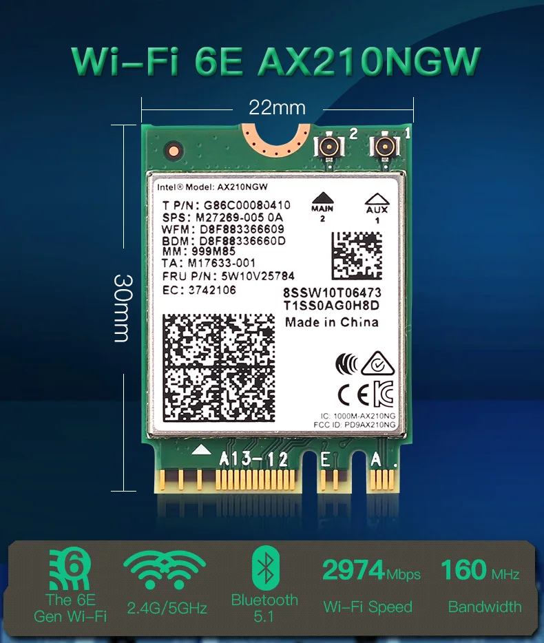 Модель: Wi-Fi 6 AX200; Интерфейс: NGFF для Mini PCI-E; Двухдиапазонный: 2,4 ГГц/5 ГГц (160 МГц); Скорость до 2400 Мбит/с (маршрутизатор должен быть на 160 МГц)(802.11ax); Поддержка Bluetooth 5,1; Поддержка Windows 10 64 бит;