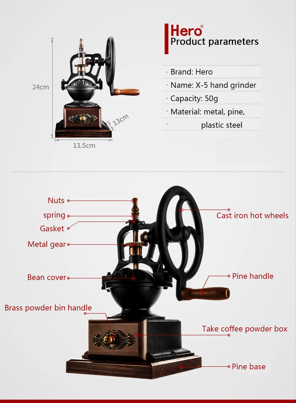 Торговая марка: Hero Материал: металл, сосна, пластиковая сталь, Керамика шлифовальное ядро Размеры: 13,5*13*24 см Ёмкость: 50 г Функция: переключения передач