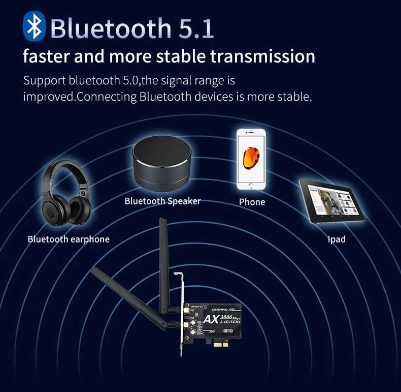1, 802.11ac/ax Wi-Fi обновление для настольному компьютеру: не более грязных кабелей Ethernet не требуется; 2, Intel AX200 Контролер внутри для супер-быстрых соединений до 2400 Мбит/с; 3, Dual Band (2,4G/5G), Wifi + Bluetooth 5,0. Скорость до 2400 Мбит/с (маршрутизатор должен поддерживать 802.11ax); 4, хороший теплоотвод, чипы не может быть повреждена, специально разработанные радиатор обеспечивает стабильный и надежный непрерывной работы; 5, внешний магнитное основание антенны дает вам больше гибкости для регулировки Размещение антенны для того чтобы получить самую лучшую прием сигнала; высокомощный дизайн для большего покрытия сигнала; 6, только в том случае, Поддержка Windows 10 * 64bit и Linux; 7, Совместимость с: почти компьютер с PCI Express (PCI-E 1X/4X/16X слот) intertaces; 8, Поддержка MU-MIMO и OFDMA.
