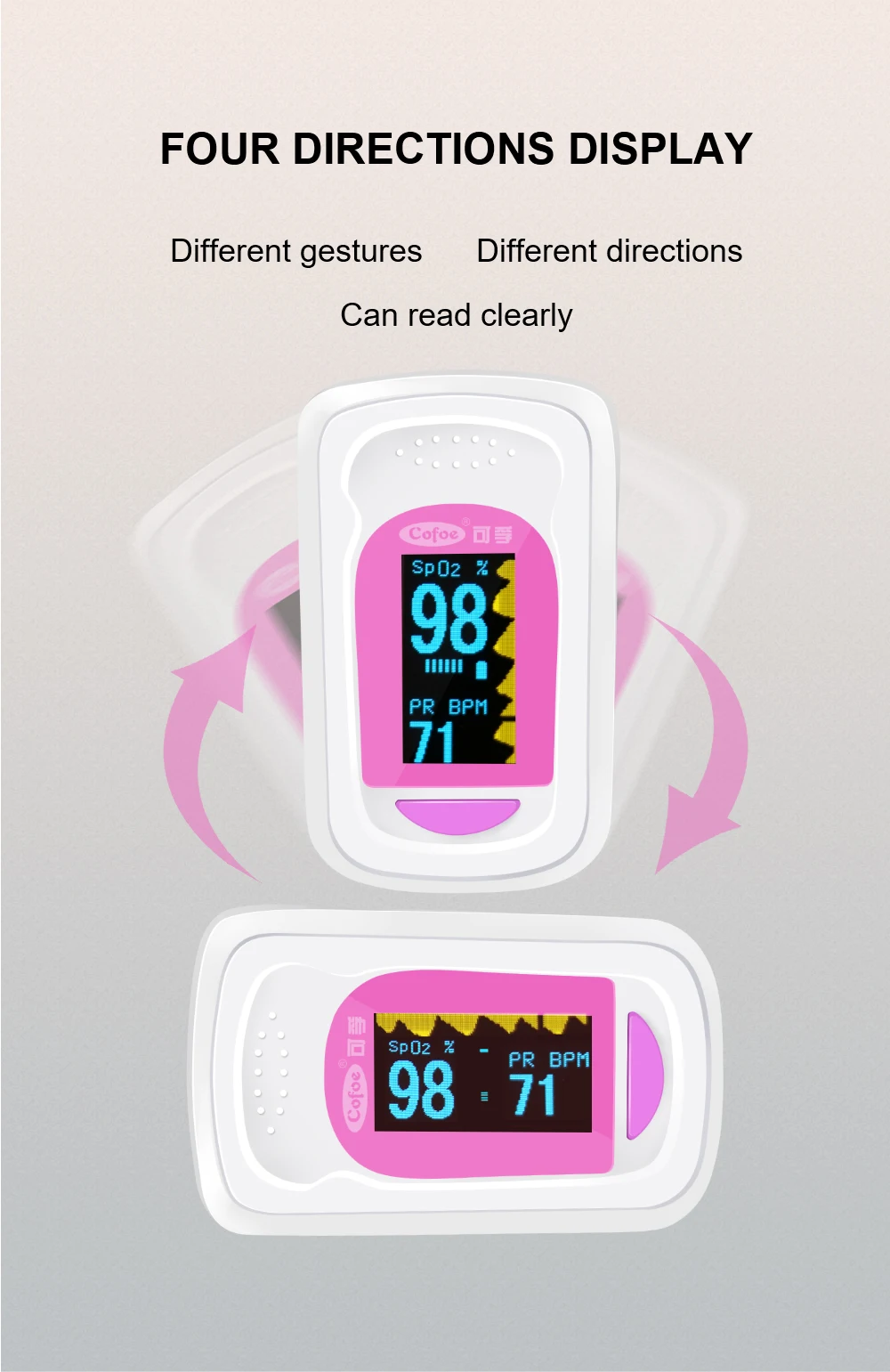 1. Нажмите функциональную кнопку, включите мощность оксиметра 2. Прижмите оксиметр, поместите палец (указательный или средний палец) полностью в камеру оксиметра. 3. После стабильного отображения формы волны (около 3 ~ 4s) , для чтения данных на дисплее. 4. Есть 2 режима отображения, нажмите кнопку функции снова и может переключиться в другой режим отображения. 5. Когда палец не находится в месте измерения 20 с, оксиметр выключается автоматически.