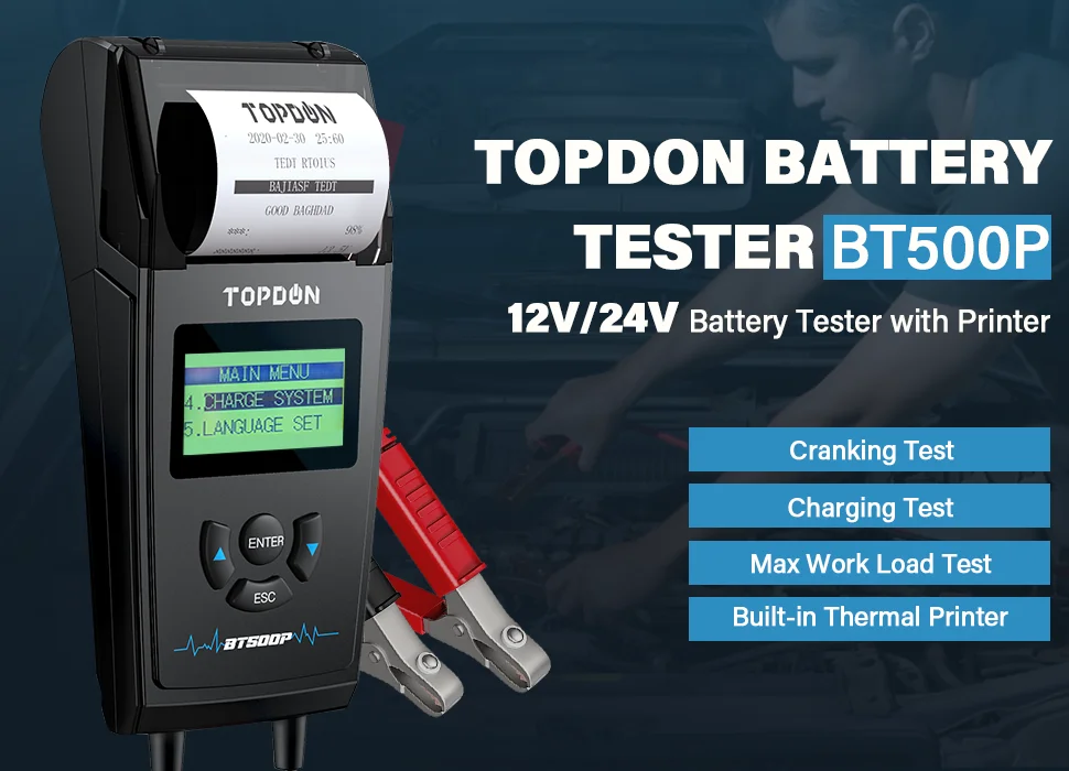 【Универсальный автоматический тестер заряда батареи topdon BT100 способен дать общий анализ состояния здоровья батарей, проверяя его заряд напряжения, внутреннее сопротивление и состояние старения. Он проверяет систему управления и зарядки генератора для транспортных средств, светильник для грузовиков, RVs, автомобилей, лодок, внедорожников, квадроциклов и даже тракторов.