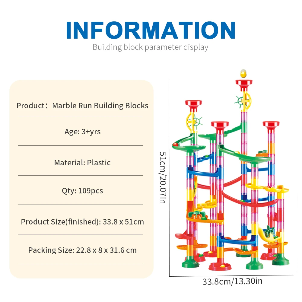 * 1. Дети могут определить цвета блоков в процессе строительства, понять пространственное чувство структуры блоков и улучшить их творческие способности мышления. * 2. 109 шт Набор строительных блоков включает 79 шт блоков и 30 шт мраморов, вы можете собрать лабиринт трек и быть творческим в объединении различных трасс. * 3. Приходите с руководством пользователя, чтобы начать творчество вашего ребенка. * 4. После сборки бусины свернутся с высокого места, и движение с разницей в росте и горизонтальном положении даст малышам чувство достижения и усилит их дух исследования. * 5. Многопользовательское участие, стимулирование конкуренции и сотрудничества, значительно улучшая игровую способность.