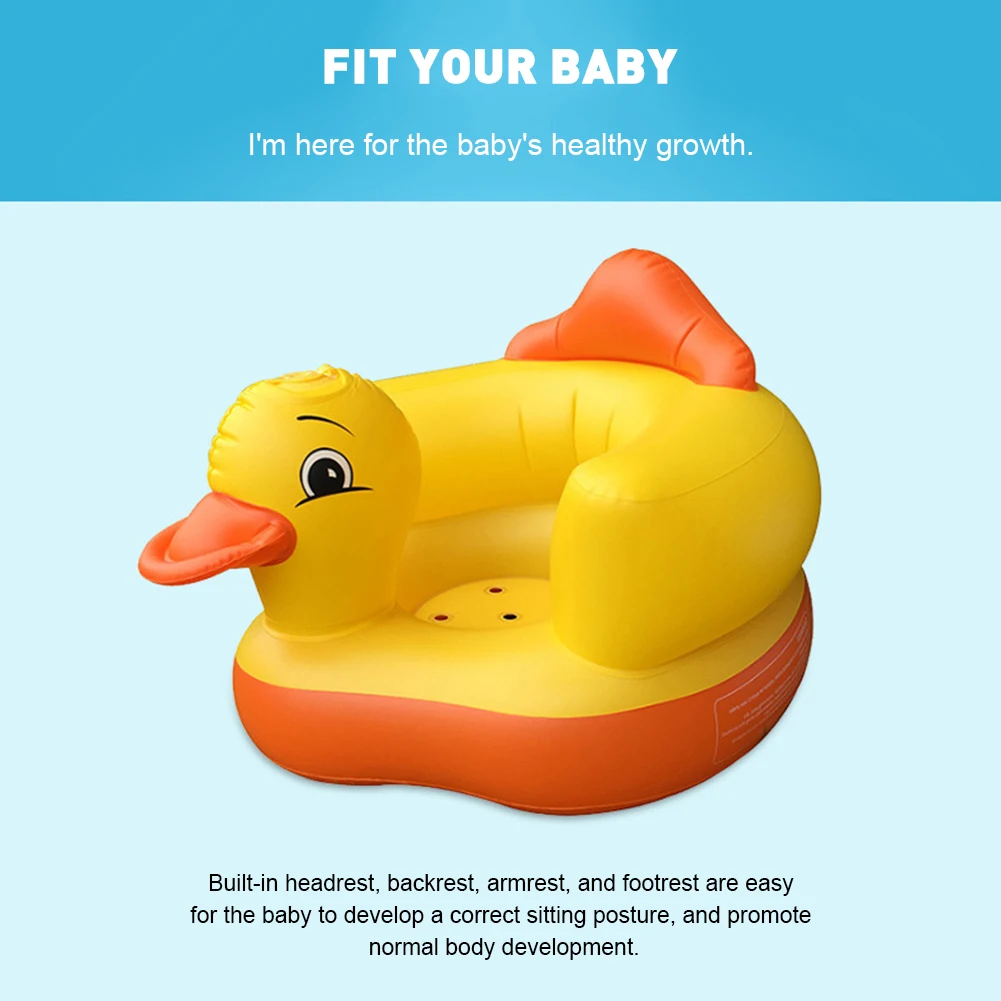 * 1. Новый дизайн подголовника для защиты шеи и полной поддержки спины для защиты ребенка. * 2. Изготовлен из ПВХ материала, Экологически Безопасный в использовании, утка Клюв также может сделать звук. * 3. Встроенный насос может надуть стул удобно, что легко носить с собой и просто использовать во время выхода или путешествия. * 4. Универсальное кресло можно использовать во время кормления, занятий сидением, купания и многого другого. * 5. Сиденье спроектировано с круглыми отверстиями, чтобы ребенок мог сидеть более комфортно и сливать воду во время купания.