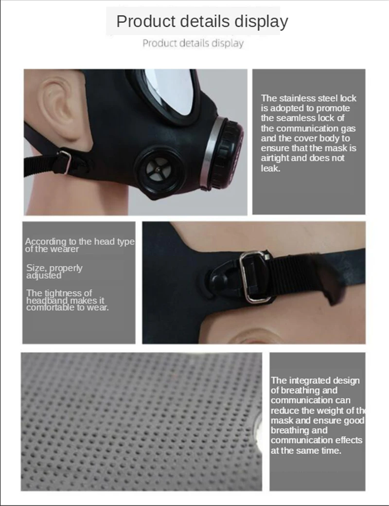 1. Применение Противогаз-это персональное защитное оборудование фильтрующего типа. Он используется в сочетании с канистром, который может эффективно защитить дыхательные органы персонала от вреда от ядов и предотвратить радиацию, биологические и химические яды, дым и радиоактивная пыль. Подходит для использования в различных рабочих местах, таких как промышленность и сельское хозяйство, научно-исследовательские единицы, транспортировка и аварийное лечение. 2. Состав и характеристики Противогаз-это тип повязки на голову, корпус крышки изготовлен из высококачественного натурального силикона, обладает хорошими физическими и механическими свойствами, с устройством вызова, закрытая рама имеет обратную складную структуру, удобно носить, может использоваться с химической защитной одеждой, линза усилена поликарбонатным покрытием, Хороший светильник, хорошая износостойкость и ударопрочность. Продукт соответствует GB2890-2009. 3. Технические характеристики 1. Защита объектов: время для предотвращения хлороводород больше, чем 50 мин (30L/мин, 1,5, поддерживающие шкалу мг/L, отноительная владность (80-80%); 2. Сопротивление износу: не более 100 Па (30 л/мин); 3 визуальное поле: общее визуальное поле не менее 75%, бинокулярное зрительное поле не менее 40%; 4. Скорость утечки маски: ≦ 0.05%; 5. Сопротивление износу ≤ 70. Вдохновляющее сопротивление ≤ 40; 6. Коэффициент передачи загрязнения нефтью канистра, %, ≤ 0,005 7. Компактность канистры: пузырьки не появляются в течение одной минуты 8. Срок хранения: 5 лет