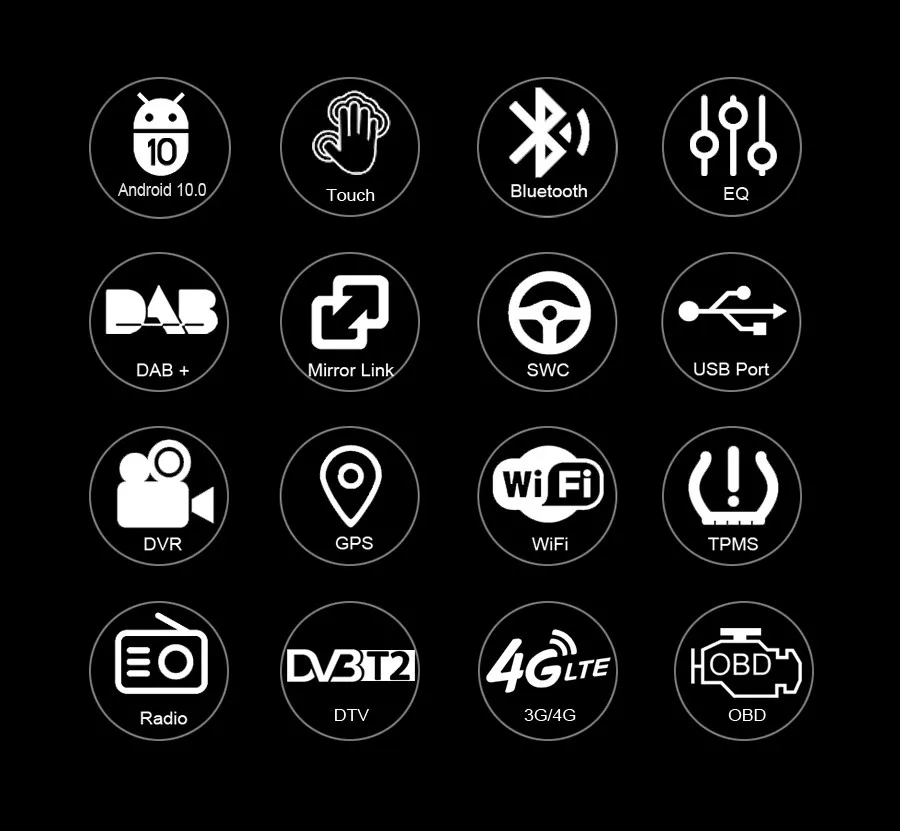 -Поддержка CarPlay, DAB +, DVB-T/T2, TPMS, OBD2, DVR, Camera, AVIN, 3G, 4G и т. д. расширенные функции.