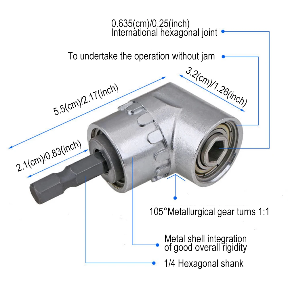 * 1. Используйте с зарядной отверткой или дрелью питания. Максимальный крутящий момент этого адаптера с углом наклона 105 градусов составляет 10 Н, и он предназначен только для головки с прямым углом.