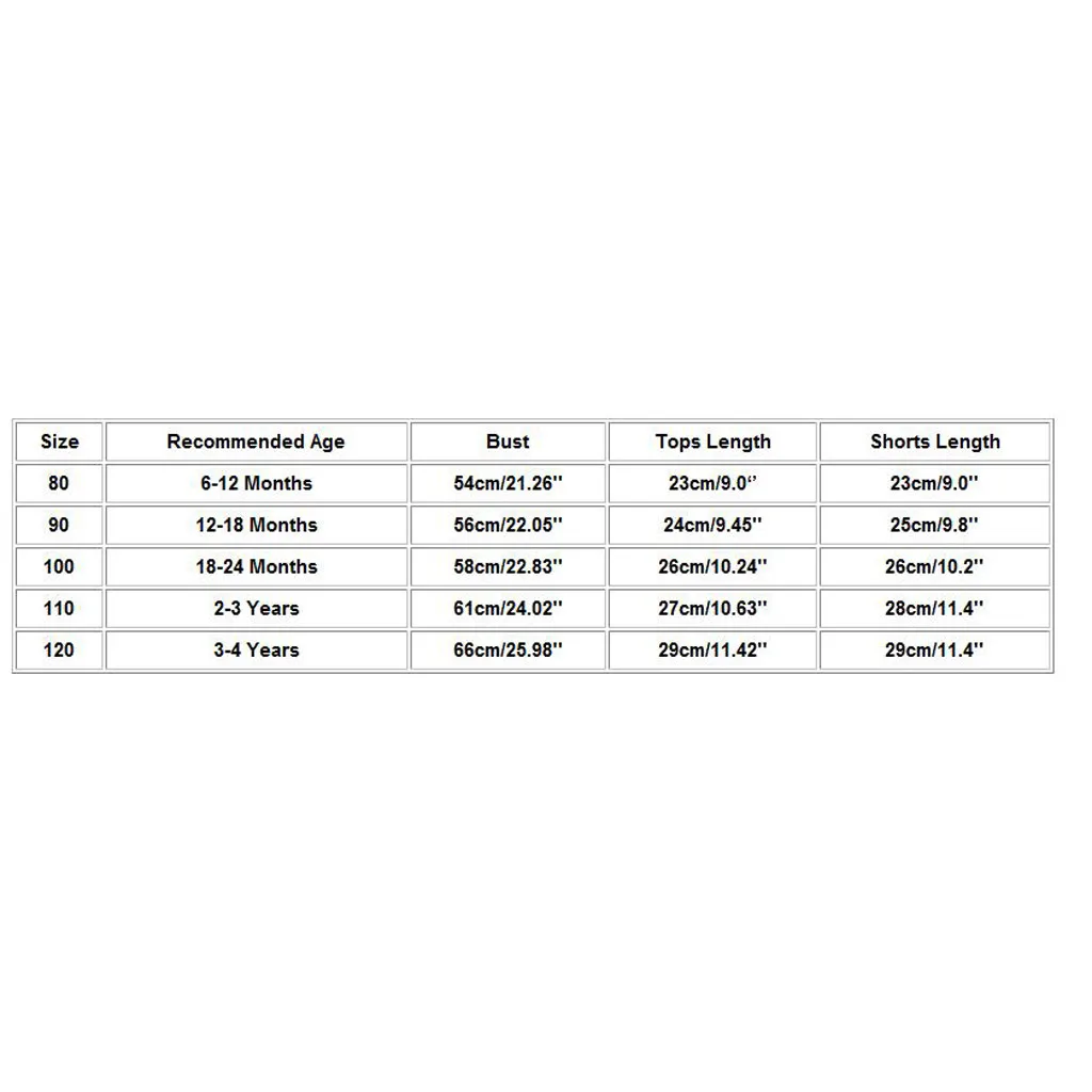 Размер Рекомендуемый возраст Бюст Длина топа Длина шорт 80 6-12 месяцев 54 см/21,26'' 23 см/9,0'' 23 см/9,0'' 90 12-18 месяцев 56 см/22,05'' 24 см/9,45'' 25 см/9,8'' 100 18-24 месяцев 58 см/22,83'' 26 см/10,24'' 26 см/10,2'' 110 От 2 до 3 лет 61 см/24,02'' 27 см/10,63'' 28 см/11,4'' 120 От 3 до 4 лет 66 см/25,98'' 29 см/11,42'' 29 см/11,4''