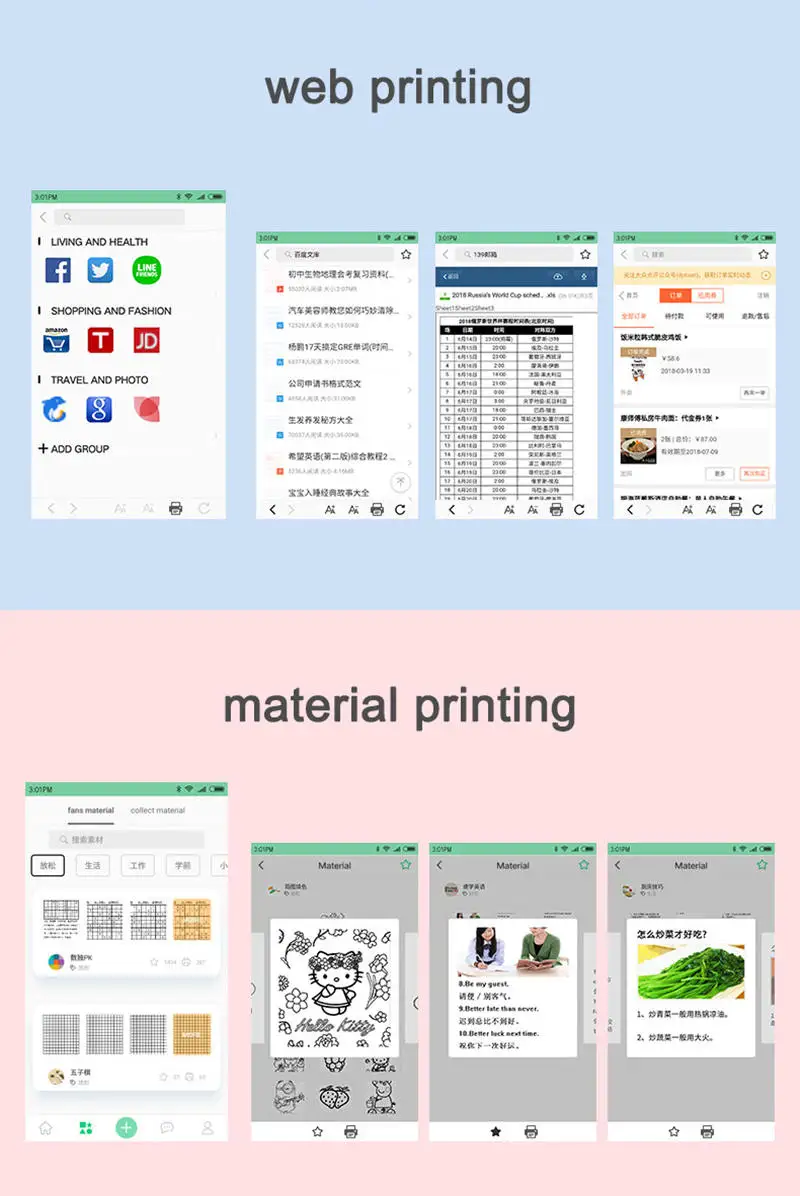 Материал: АБС-пластик Размер изделия: 79 мм * 79 мм Цвет: розовый, синий, белый Питание: USB зарядка Размер бумаги: 57*30 мм Интерфейс: bluetooth Печатные материалы: термальная бумага Система поддержки: IOS, android Использование: Печать чертежей, фотографий, текста, списков, материалов и т. Д.