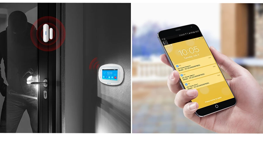 Когда датчик двери срабатывает, он будет звучать и передавать сигнал на системную панель. Хост системы сигнализации будет звучать и отправлять SMS/звонки на ваш предустановленный номер телефона. Вы получите уведомление в первый раз.