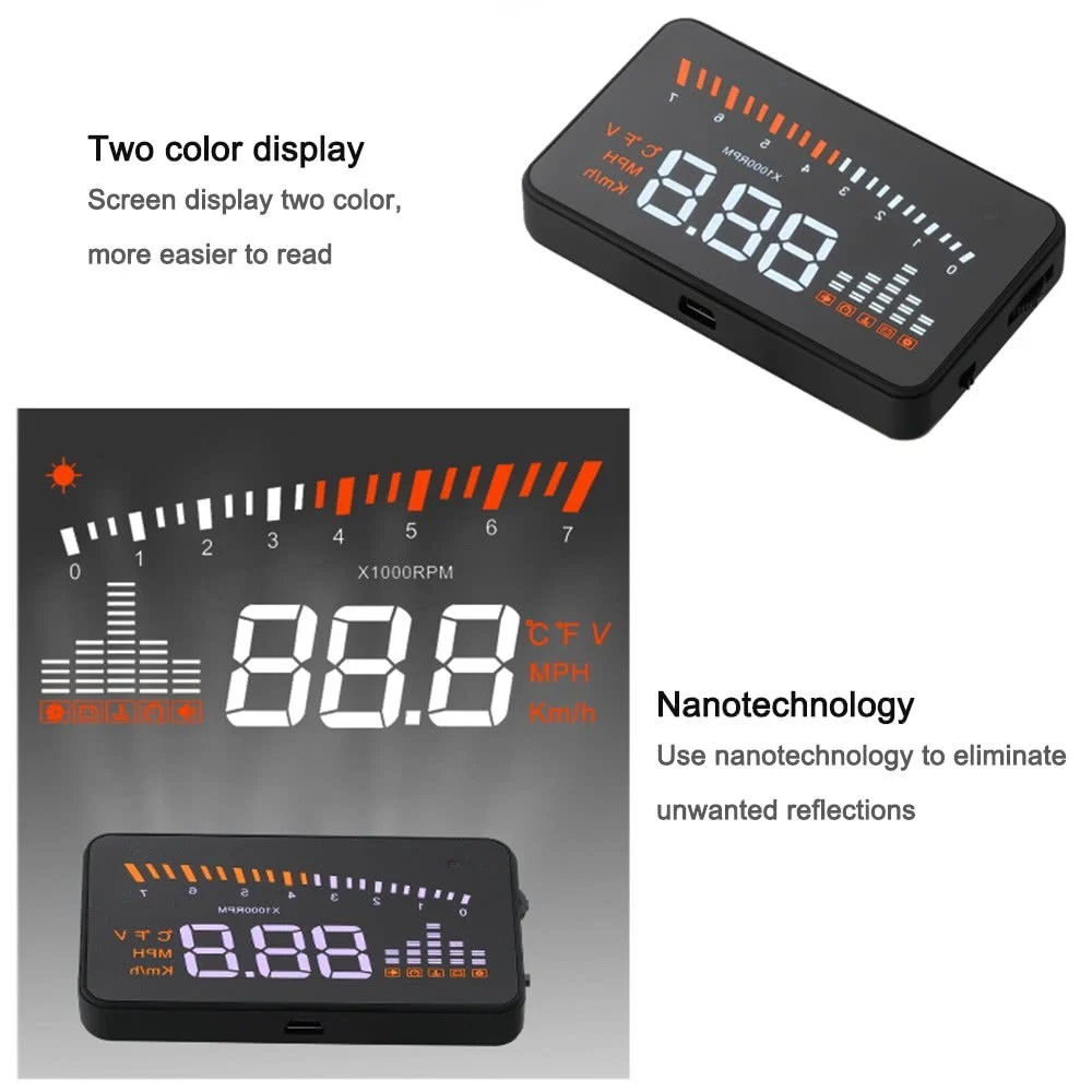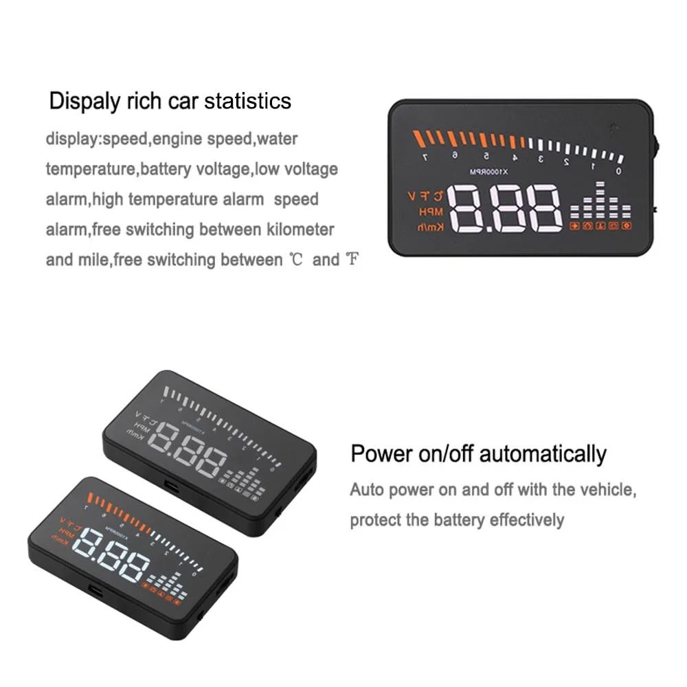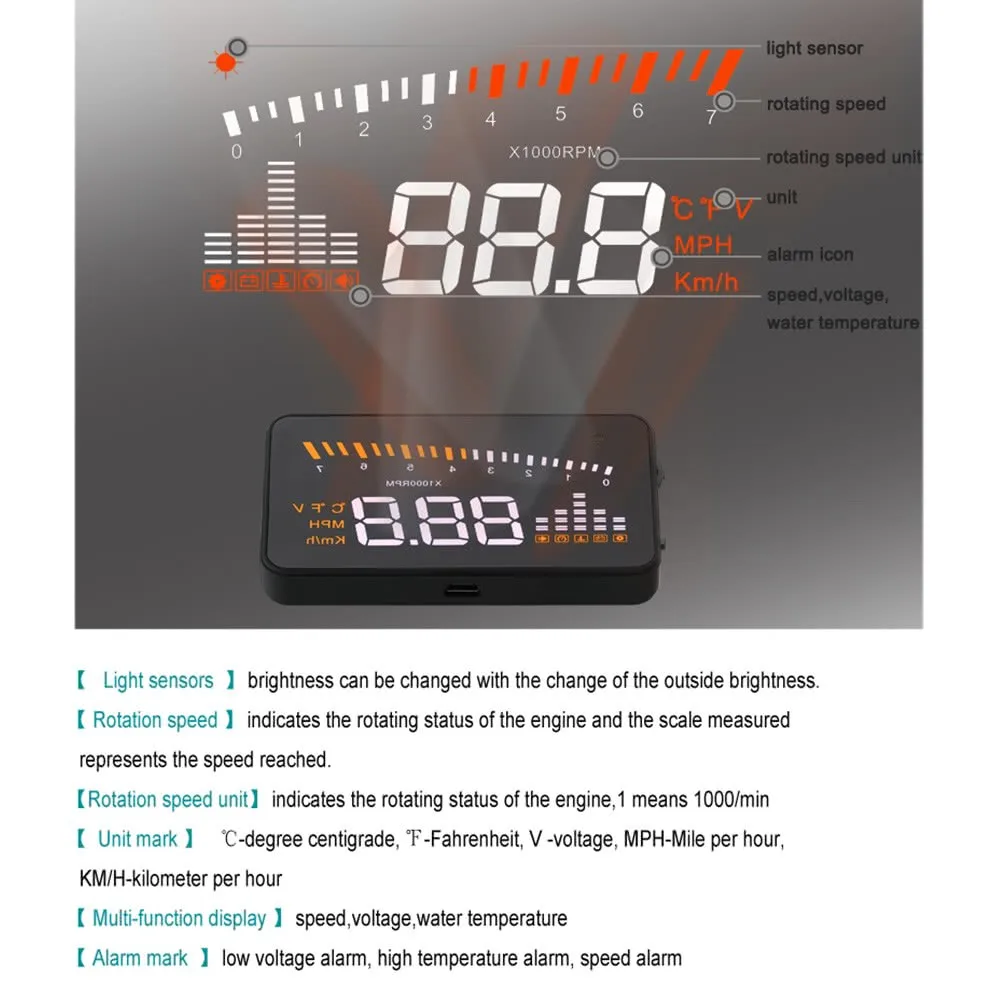 Этот продукт предназначен для безопасности водителей, особенно в высокоскоростном вождении ночью, HUD может держать водителя в глаза на дороге и может уменьшить автомобильную аварию. HUD может проецировать важную информацию (например, скорость) на лобовое стекло, это может помочь неопытному новичку контролировать свою скорость и избежать нарушения скорости в скоростной дороге. Что еще более важно, это позволяет водителю мгновенно считывать номер в большом видении и всегда заставлять водителей следить за дорогой в ясном уме. Наш HUD может отображать много полезной информации и позволяет вам испытать скорость, а также обеспечить безопасность вождения и удовольствие от вождения. Особенности: 1. Автоматическая адаптация моделей автомобилей, и может применяться для автомобилей в соответствии с OBD II или EUOBD (бортовой автоматической диагностической системой). Подключи и работай. 2. 3 "экран и дисплей высокой четкости. 3. Многоцветная конструкция делает экран более насыщенным и легче читать. 4. Использование нано-технологии для устранения нежелательных отражений и может сделать отображение информации более точным. 5. Отображение богатого содержания: скорость, скорость двигателя, температура воды, напряжение батареи, Сигнализация низкого напряжения, сигнализация высокой температуры, сигнализация скорости, свободное переключение между километром и милей, свободное переключение между ℃ и ℃. 6. Автоматическое включение и выключение с запуском и выключением транспортного средства, эффективная защита автомобильного аккумулятора; Сохраняя режим ручного переключения, и более легко управлять HUD. 7. Автоматический и ручной режим регулировки яркости, вождение без бликов. Технические параметры: Температура окружающей среды: - 40 ℃ ~ + 80 ℃ Барометрический пресс: 86-106 кПа Относительная влажность: 10%-95% Голос окружающей среды: <= 60 дБ Будильник уровня звука: >= 30 дБ (A) Рабочее напряжение: 9 В ~ 16 В постоянного тока (12 В постоянного тока/400 мА) Вес продукта: 40 г/1,4 oz Размер посылка: 17*13*4,5 см/6,7*5,1*1,8 дюймов Посылка Вес: 192 г/6,8 oz Примечание: HUD проектирует информацию о дисплее на лобовом стекле автомобиля, потому что ветровое стекло двойное, что сделает двойное изображение на ветровом стекле при отображении. Двойное изображение автомобиля будет отличаться. Если вы видите четкую информацию о дисплее, нет необходимости использовать отражающую пленку. Если есть двойное изображение, используйте отражающую пленку. Установка отражающей пленки: Во-первых, пожалуйста, поместите поставляемый нескользящий коврик перед приборной панелью, а затем поместите на него HUD. Во-вторых, пожалуйста, наклейте отражающую пленку на ветровое стекло. Отражающая пленка должна быть наклеена прямо над главной машиной, и она должна быть в состоянии отразить весь экран дисплея. Посылка: 1 * HUD 1 * Разъем OBDII 1 * нескользящий коврик 1 * Руководство пользователя