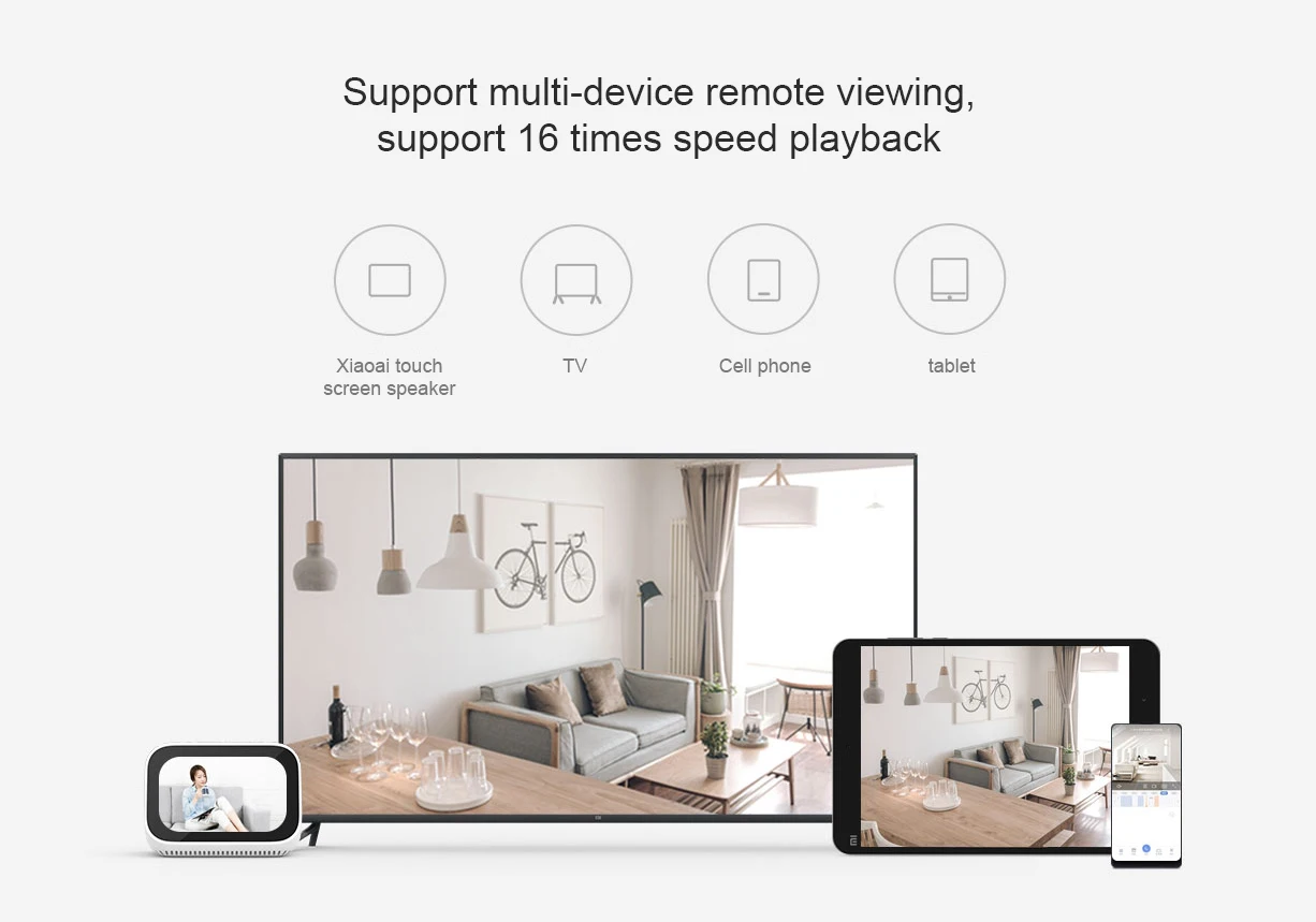 Поддержка удаленного просмотра нескольких устройств, таких как Xiaoai touch screen speakers и Xiaomi TV. Для записи истории, хранящейся на MicroSD карте, поддержка 1x / 4x / 16x скорости воспроизведения, быстрый просмотр, экономия времени и усилий.