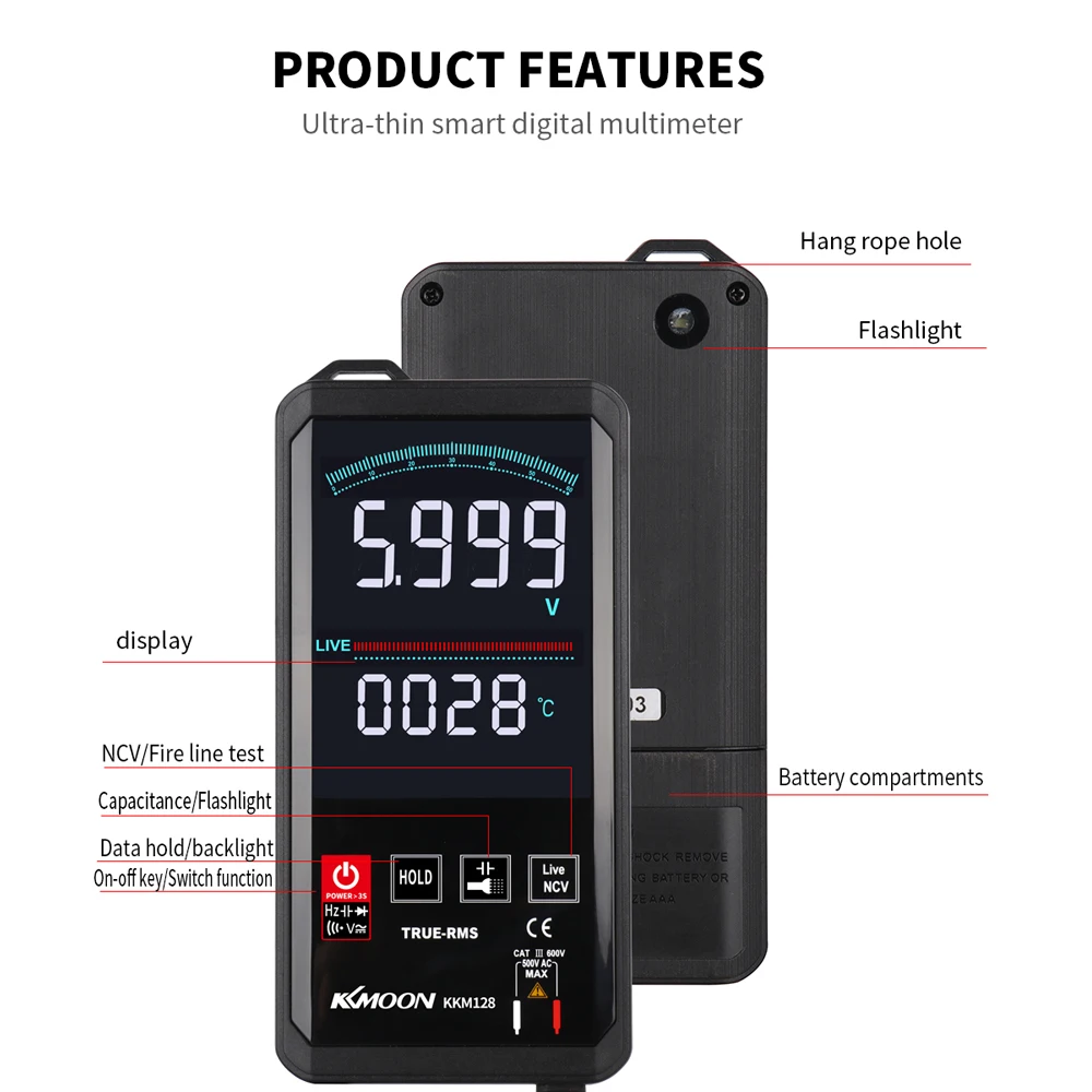 Функция: тест на напряжение, Частотный тест, тест на емкость, тест на сопротивление, диодный тест, распознавание пожарного провода, фонарик, электрическое поле, звуковой сигнал, истинный RMS, автоматическое отключение, хранение данных.