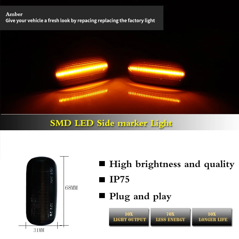Хотите дать вашему Audi более современный вид с увеличенным стилем в ночное время? В комплект поставки входит одна пара боковых габаритных огней для водителя и пассажира с черной темной дымчатой линзой. Каждая деталь питается от 21 высокомощного янтарного SMD светодиодного диода с супер ярким выходом освещения. Придайте вашей поездки более современный внешний вид светодиода с повышенной безопасности, видимостью и стилем в ночное время!