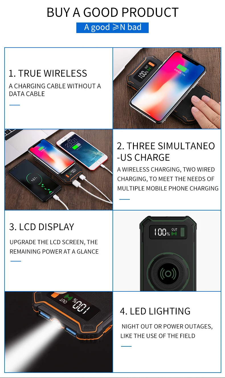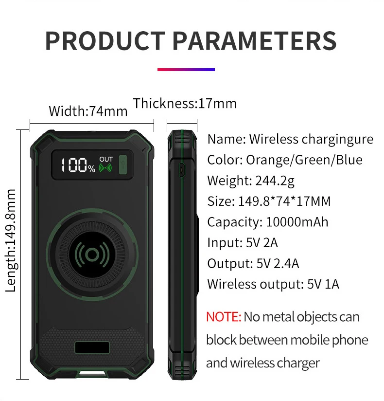 Название: Беспроводной внешний аккумулятор 10000 мАч Цвет: оранжевый/зеленый/синий Вес: 244,2 г Размер: 149,8*74*17 мм Ёмкость: 10000 мА-ч Вход: 5 В 2 А Выход: 5 в 2,4 А Беспроводной Выход: 5 в 1 А Примечание: никакие металлические предметы не могут блокировать мобильный телефон и беспроводное зарядное устройство