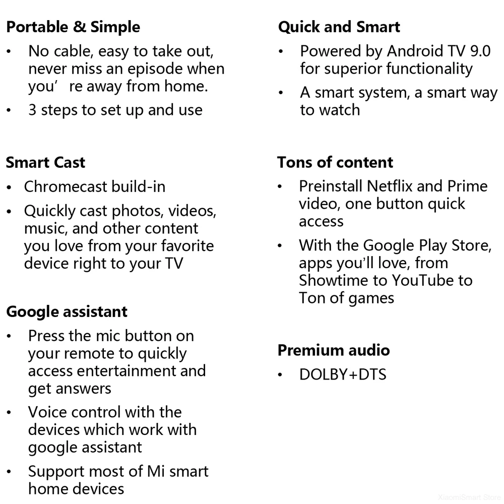 Бренд: Xiaomi Тип: ТВ-ключ Графический процессор: Mali 450 Процессор: четырехъядерный Cortex-A53 2,0 ГГц Оперативная память: 1 Гб ПЗУ: eMMC 8 Гб Операционная система: Android TV 9,0 Разрешение на выходе: 2K Видеодекодер: VP8, VP9, VC-1, H263, H.264, H.265, MPEG1/2/4 Формат видео: RMOV, AVI, MKV, TS, Mp4 Аудио декодер: DOLBY, DTS Формат аудио: MP3, AAC, Flac, OGG Формат фотографий: JPG, BMP, GIF, PNG, TIF Другие: Поддержка объемного звучания 5,1: Да Wi-Fi: 2,4 ГГц + 5 ГГц двухдиапазонный Wi-Fi 802,11 a/b/g/n/ac Bluetooth: bluetooth 4,2 Питание: USB 2,0 порт x1 Интерфейс: OTG, Type-C, USB3.0 Язык s: многоязычный Содержание: Google Play, Netflix, YouTube, Prime video и т. д. RemoteRemote : bluetooth-пульт с голосовым помощником google Потребляемая мощность: 5 Вт Требования к питанию: Тип питания: цифровой источник питания Входная мощность громкости: 5 В Вход адаптера питания: 100-240 В/50-60 Гц Поддерживает объемный звук Dolby и DTS Встроенный Google assistant Предустановленная кнопка быстрого доступа к Netflix Поставляется с bluetooth голосовым пультом дистанционного управления Посылка входит: 1 x ТВ-Стик Xiaomi Mi 1 x голосовое дистанционное управление 1 x Руководство пользователя на английском языке