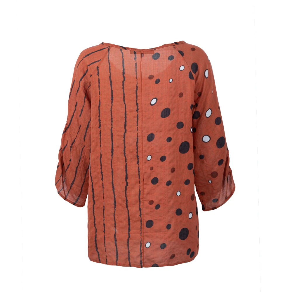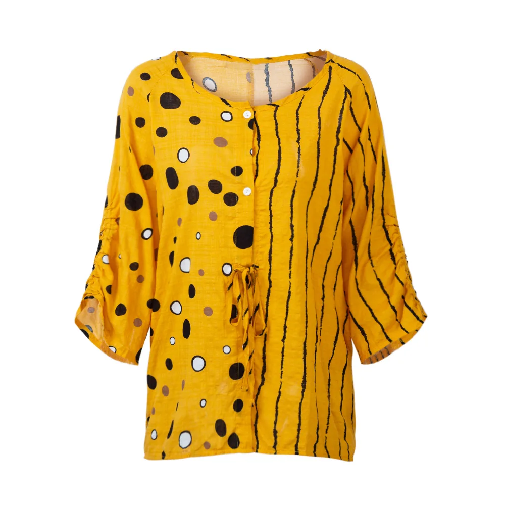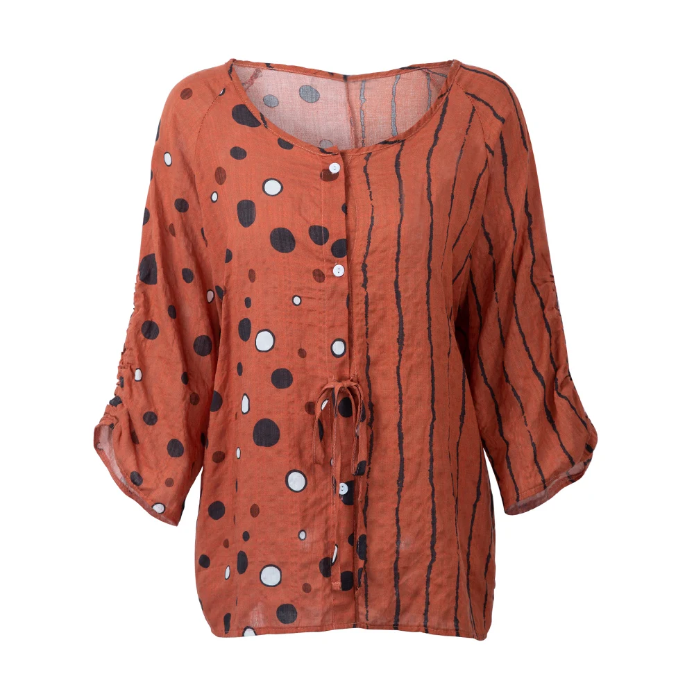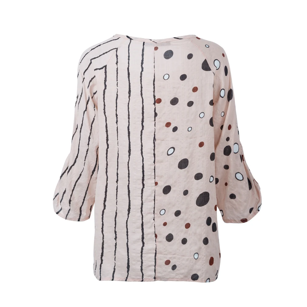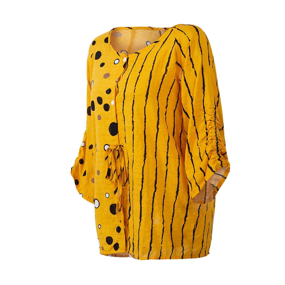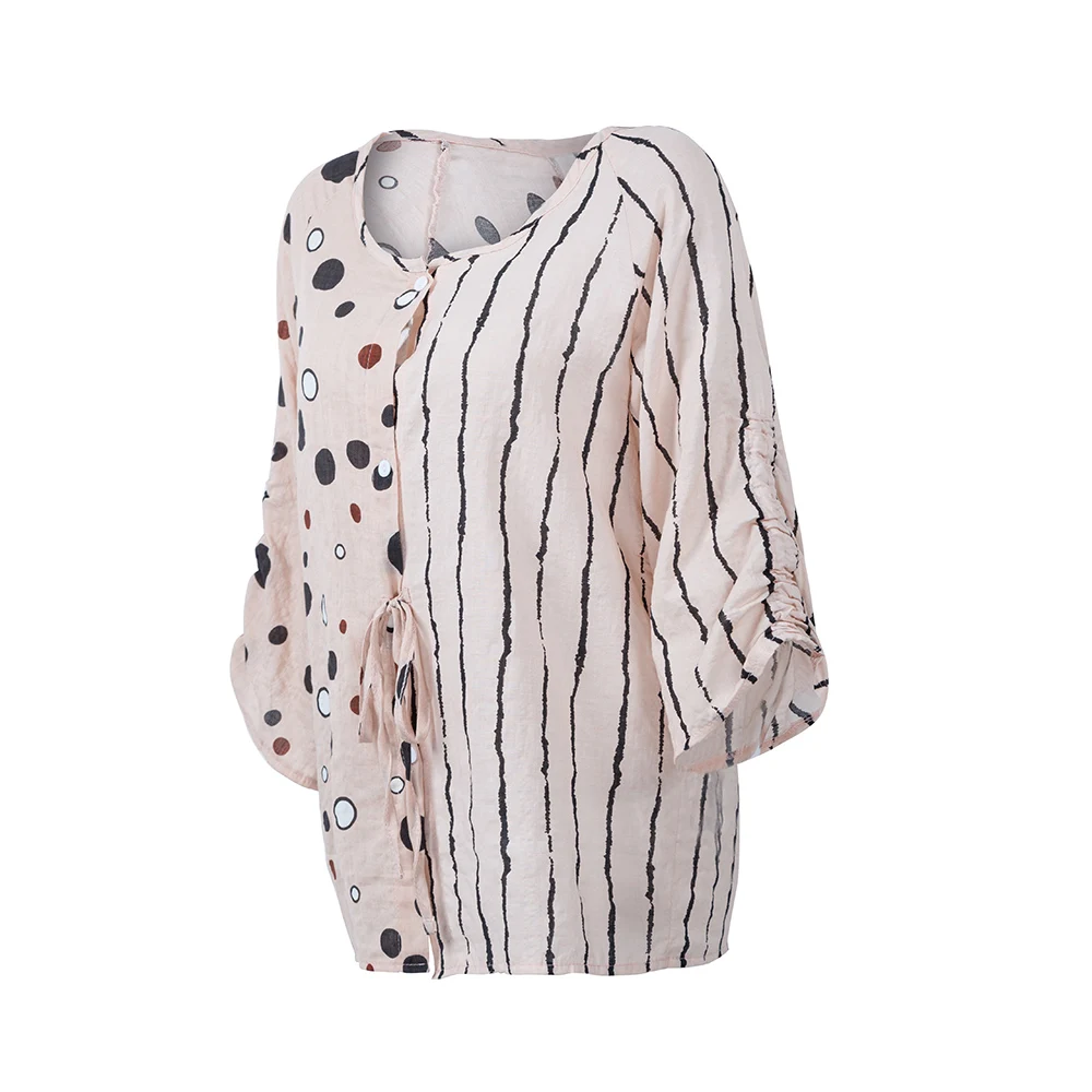 Винтажная рубашка с принтом в полоску и горошек, круглым вырезом, воротником на пуговицах спереди, рукавами реглан три четверти и эластичным дизайном.