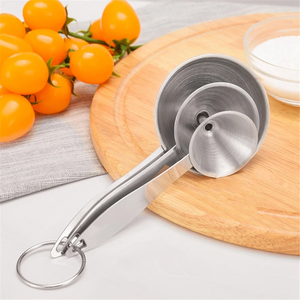 Регулируемые блокирующие круглые Висячие кольцевые струны 3 воронки вместе через отверстие в длинной ручке, что делает аккуратное и удобное хранение на кухне.