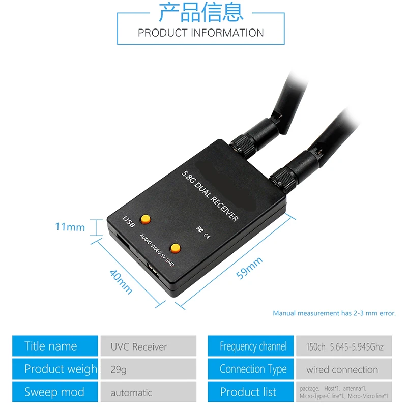 Примечание. * В один антенный приемник добавлена антенна для обеспечения более стабильных сигналов * Добавьте кнопку, чтобы было удобнее регулировать канал * Увеличение функции отображения формы волны канала * Добавление воспроизведения звука в приложении * Нажмите и удерживайте любую кнопку, чтобы войти в режим автоматического сканирования * Мобильные телефоны с поддержкой процессор qualcomm поддерживают практически все * Некоторым телефонам необходимо открыть функцию OTG в настройках UVC-приемник-это новый приемник, который можно подключить к смартфону и компьютеру. Площадка непосредственно вместо тяжелого монитора и хорошо подходит для тех, кто чувствует головокружение при ношении FPV-очков. Имеет низкую задержку около 100 мс. Автоматический поиск 5,8 каналов позволяет охватить все диапазоны частот G. Обратите внимание: Этот приемник подходит только для телефонов Android, которые поддерживают UVC, и убедитесь, что ваш телефон может работать с разъемом OTG.