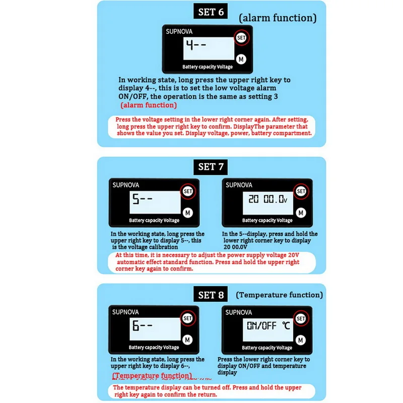 < Alarm: The indicator flashes and buzzer alarm when it is low or battery voltage, the low/ high voltage can be setting.