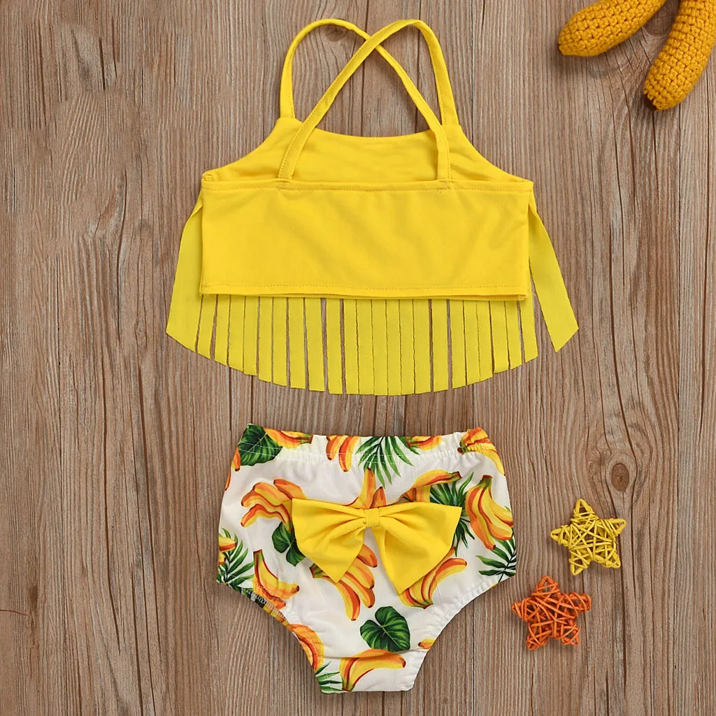 Купальный костюм для маленьких девочек; Летний купальный костюм с кисточками и принтом на бретельках; Пляжная одежда; Комплект бикини; Купалники; Детская одежда; t5
