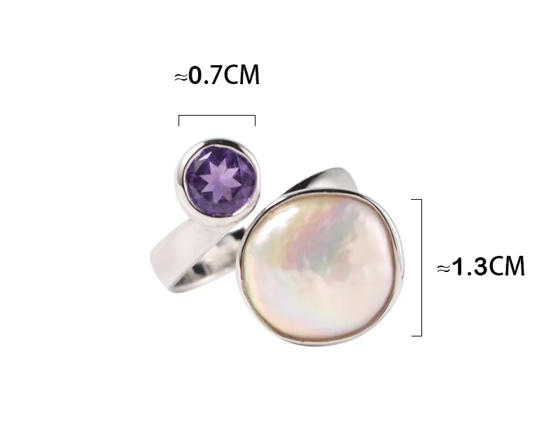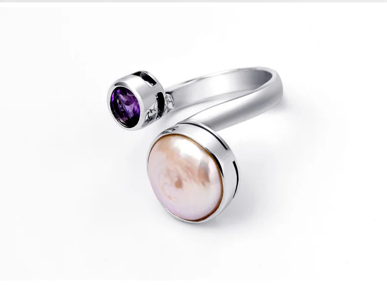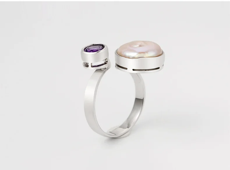 Большой овал в кольце-это натуральный пресноводный жемчуг, а маленький круг-натуральный аметист. Металлическая часть 925 пробы серебристого цвета.