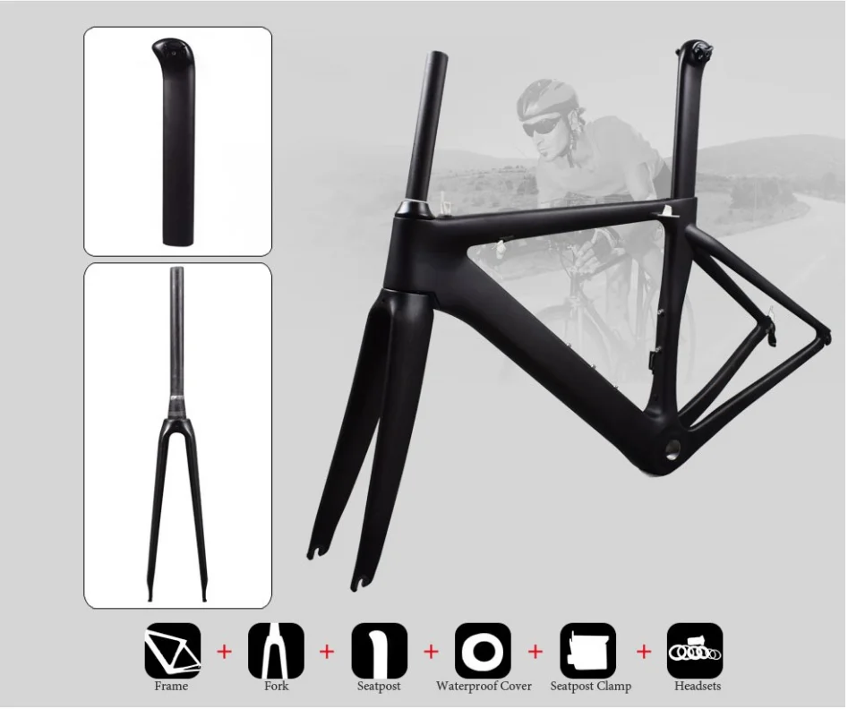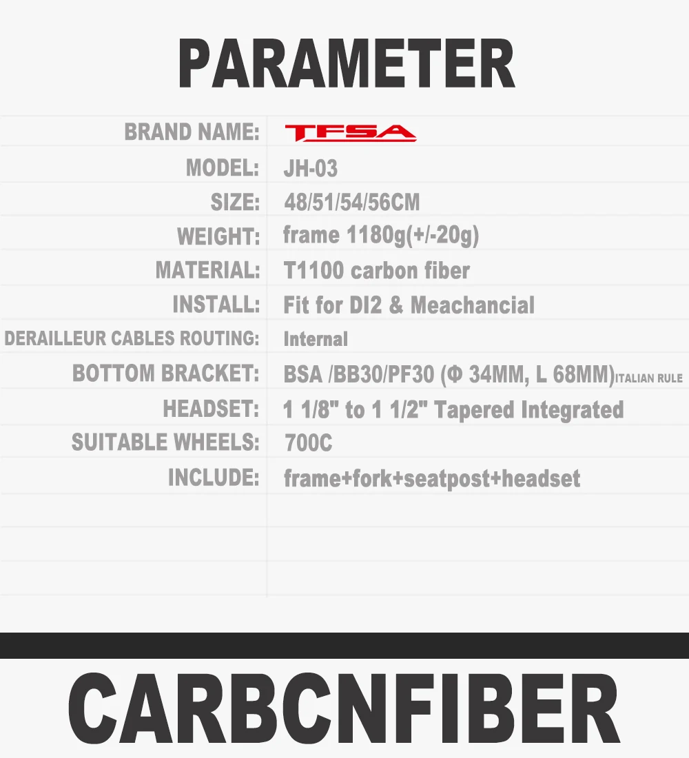 Название бренда: TFSA Модель: JH-03 Размер: 48/51/54/56 см Вес: Рама 1180 г (+/-20 г) Материал: углеродное волокно T1100 Установка: подходит для DI2 и Meachancial Переключение кабелей: внутренний Нижний Кронштейн: BSA/BB30/PF30 (φ 34 мм, L 68 мм) Гарнитура: 1 1/8 "до 1 1/2" коническая интегрированная Подходящие колеса: 700C В комплект входит: Рама + вилка + подседельный штырь + гарнитура