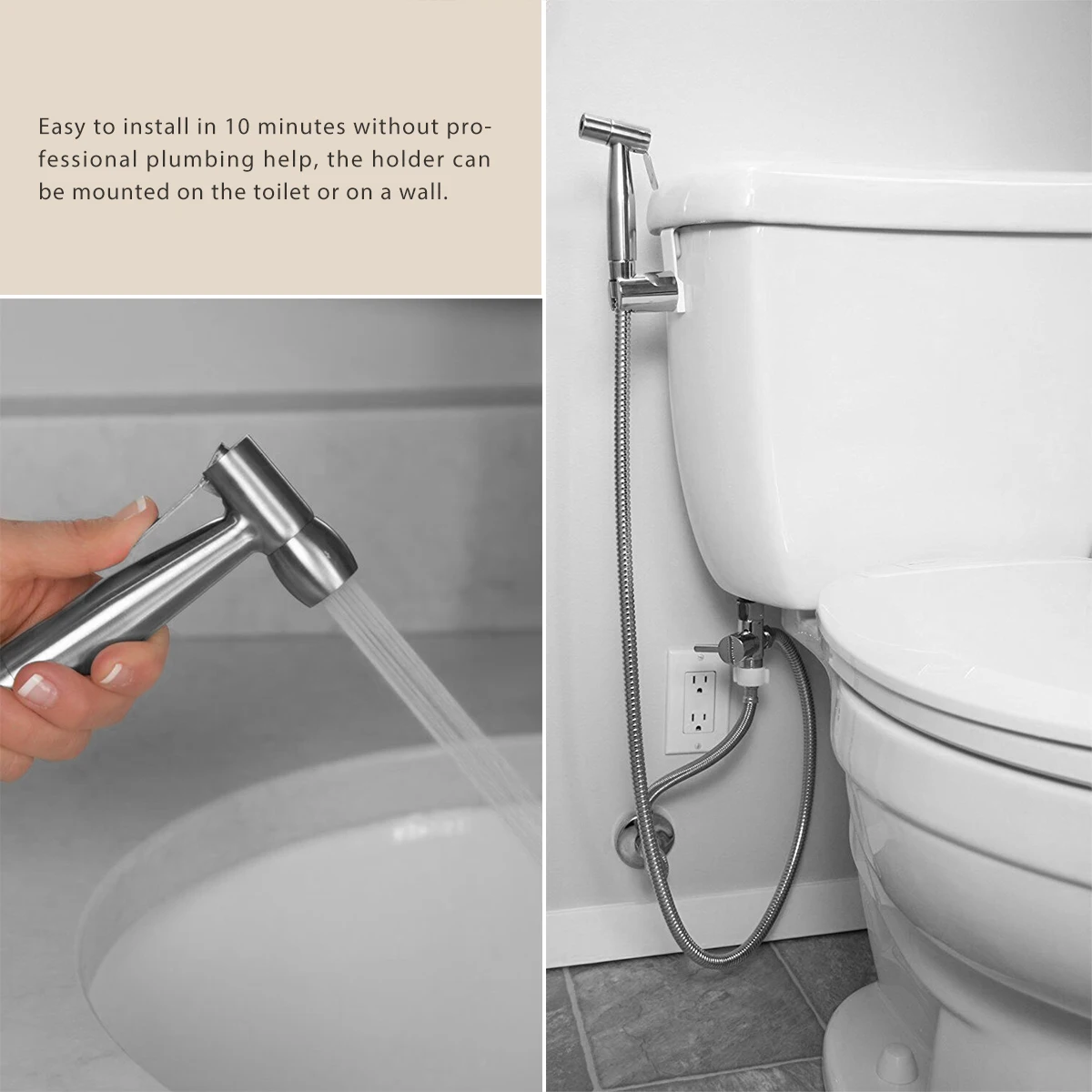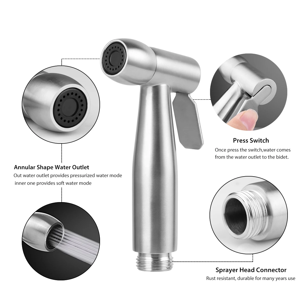 Премиум качество, 304 биде из нержавеющей стали опрыскиватель, шланг из нержавеющей стали и латунный клапан, устойчивый к ржавчине, прочный в течение многих лет использования.