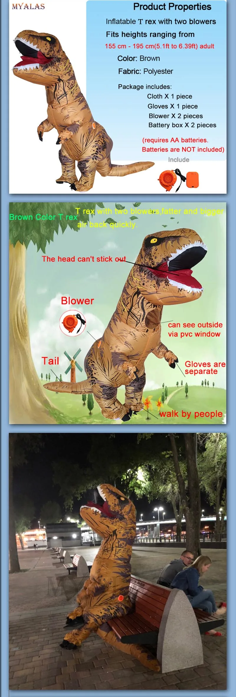 T-rex в парк развлечений костюм: коричневый ColorSize: на рост от 1,5 м до 1,95 м (5,1 футов до 6,39 футов) посылка включает в себя: ткань, Перчатки, двух вентиляторов (не включает в себя какие-либо аккумулятор) материал: водонепроницаемый polyesterWeight: примерно 0,99 кг посылка Размеры: 30x15x4 см