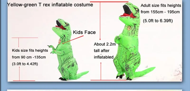 Детские Размеры костюм T-rex для заказа цвета: черный цвет Размеры: на рост от 90 см до 135 см (3,0 футов до 4.42ft) посылка включает в себя: ткань, Перчатки, один вентилятор (не включает аккумулятор)