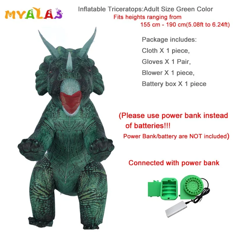Полноразмерный надувной костюм трицератопа: зеленый цвет Размер: подходит для высоты от 1,55 м до 1,90 м (от 5,08фт до 6,24фт) комплектация: ткань, перчатки, один нагнетатель (без батареи) материал: водонепроницаемый polyesterWeight: приблизительно 0,75 овощей и фруктов условия Размеры: 30x15x4 см