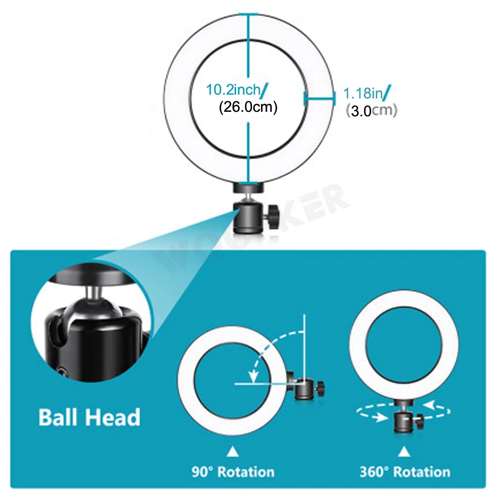 Регулируемый Вертикальная: поворот на 180 ° Горизонтальный: Поворот на 360 ° Кольцо может работать как Настольный светильник, удаляя палку для селфи