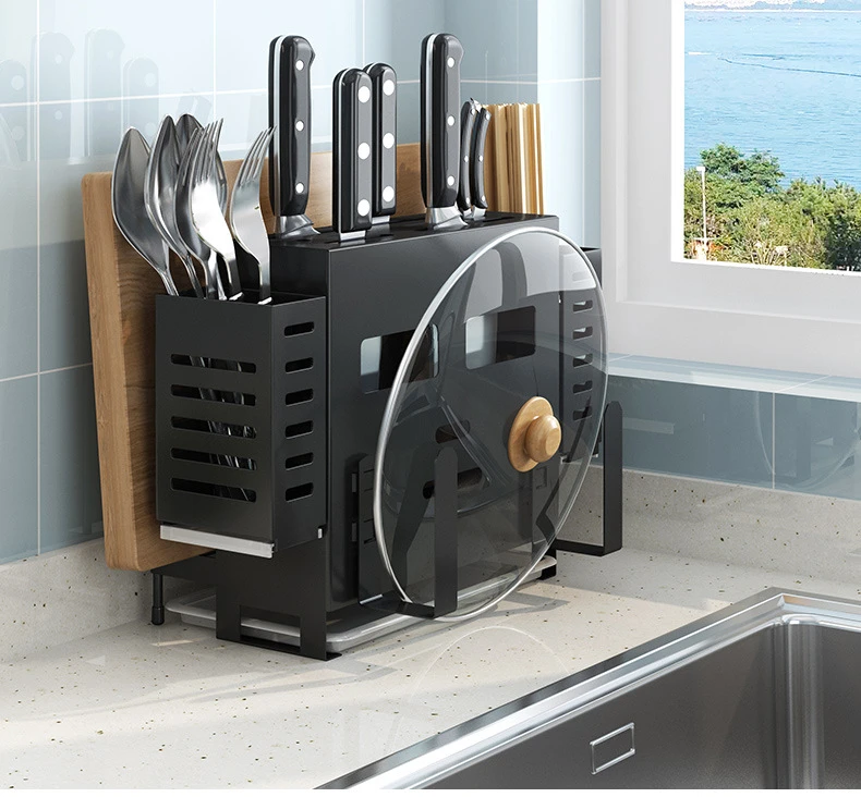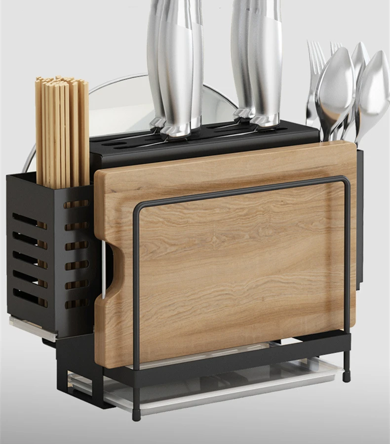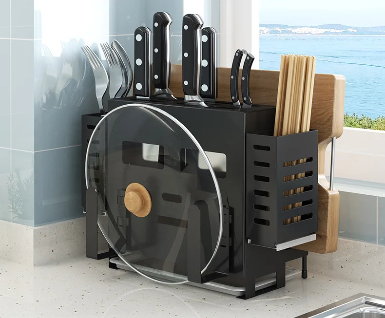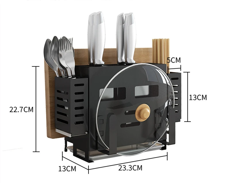 2. Содержит стойку для ножей, которая может вместить 5-6 ножей, 2 коробки для хранения ложек, 1 разделочную доску, 1 стойку для крышки кастрюль.
