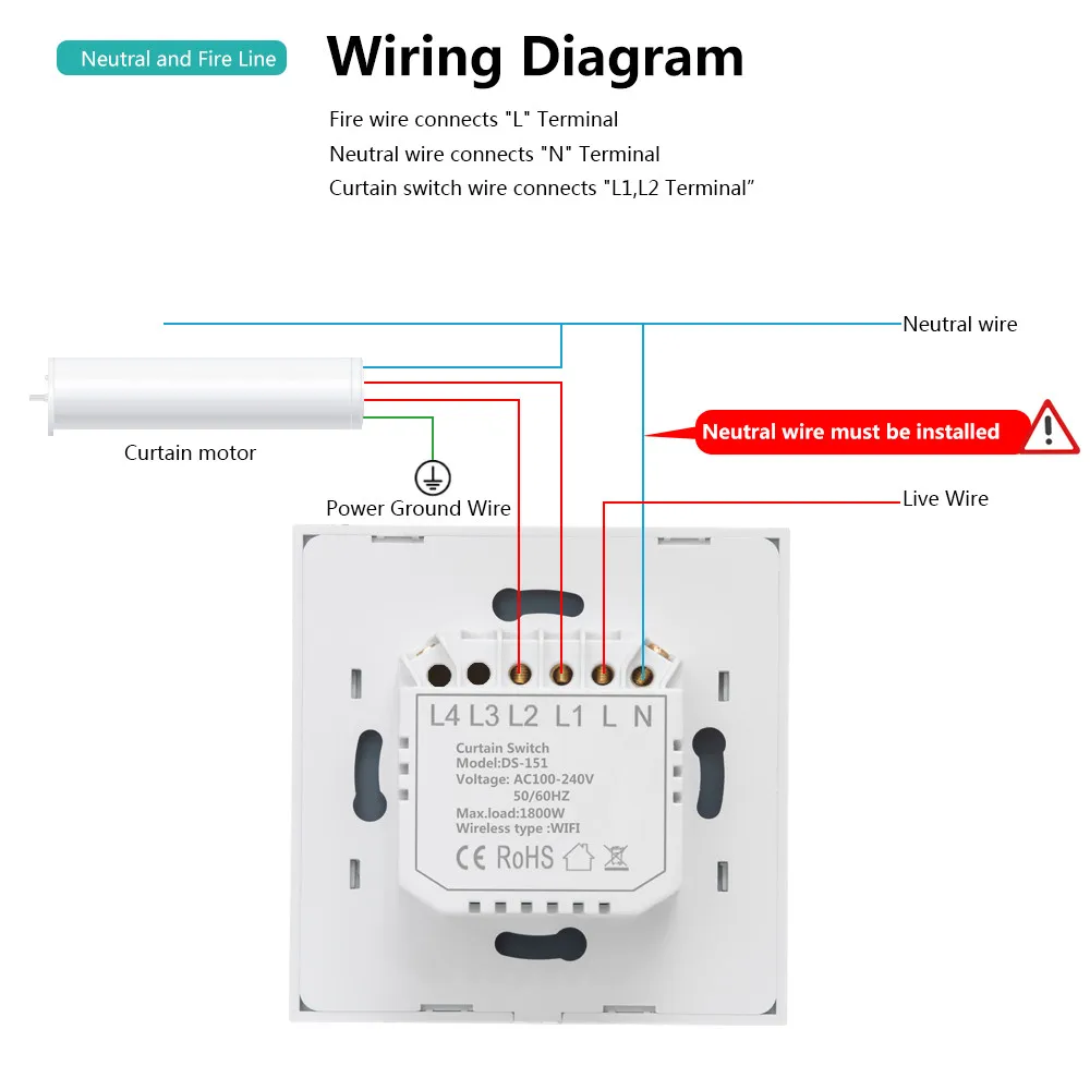 Обратите внимание, что для двигателя требуется не менее 3 проводов, провода под напряжением 1, провода под напряжением 2 (для открытия и закрытия) и нейтрального провода, В противном случае он не может быть подсоединено во время использования мотор, переключатель может быть совместим с любыми мотор для рольставни с электроприводом с 100-250 переменного тока входного напряжения, 600 Вт макс. Как Somfy, Dooya, A-OK и т. Д., но для установки должен потребоваться нейтральный провод.
