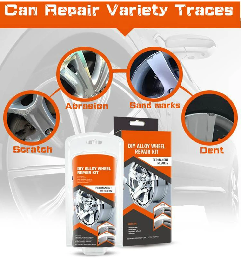 ★Высокое качество -- Набор для ремонта колес разбавляет следы поверхности колеса и устойчив как к вибрации, так и к нагреванию. ★Применение-предназначен для ремонта повреждений, царапин, небольших вмятин и других повреждений автомобильного колеса. Экономьте свои деньги и ценное время. ★Подтвердите площадь ремонта: если он слегка поврежден, используйте влажную наждачную бумагу для размещения контуров на отремонтированной поверхности и область ремонта лака с серебряным сплавом. ★Если область повреждения большая или с вмятинами: затем используйте клей для ремонта: Нажмите необходимый клей для ремонта на коврик. Смешайте 2 компонента до постоянной серой массы с помощью шпателя. (Завершите within2-4mins смешивания) ★Ремонт: Заполните смешанным клеем, чтобы перелить поврежденную область. Дайте высохнуть в течение 15 минут.