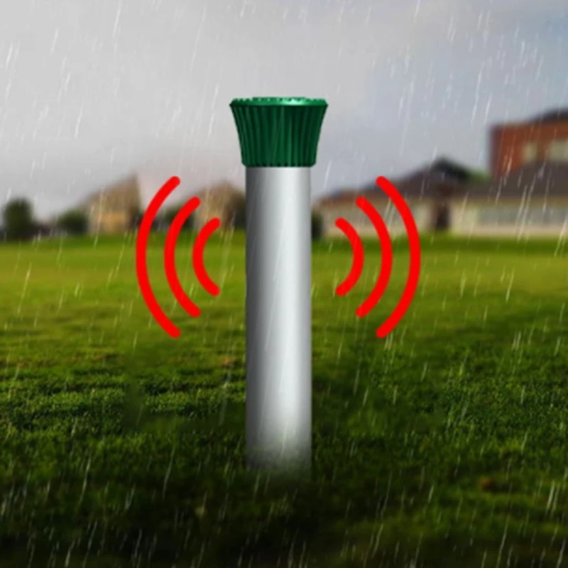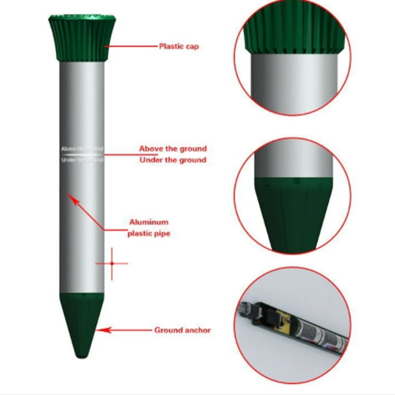 Отпугиватель Кротов вибрирует и производит звуковые волны около 400-1000 Герц через зуммер, он может отогревать родинки, змеи, гофры, волы, перхоти и другие разрушительные грызуны. Животные не будут находиться рядом с вашей защищенной областью!