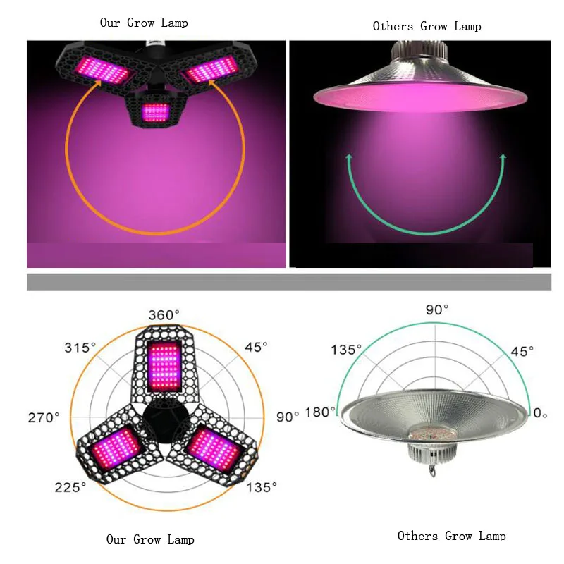 Как работает удельная Длина волны: Красный 620 ~ 630нм, 640 ~ 680нм --- лучший спектр для цветения и плодоношения растений. Синий 430 ~ 440nm, 450 ~ 480nm --- это максимальные пиковые точки для вегетативного роста и поглощения. Белые светодиоды --- полный спектр/широкий Кельвин обеспечивают заполнение всех недостающих спектров и добавляют люкс. Теплые светодиоды --- обеспечивают энергию, способствуют фотосинтезу растений. УФ 380 ~ 410нм --- начинается процесс поглощения хлорофилла. УФ (ультрафиолет) обладает уникальной функцией стерилизации и убивает фитопатогенные бактерии. IR 710 ~ 730nm --- здесь небольшое поглощение хлорофиллом, но фитохром использует хорошую часть. На цветение и прорастание влияют. Входное напряжение: 85-265 (В) Светодиодный чип: Epistar/ Epistar Светодиодный светильник: 108/126/144 Световой поток: 2200/3400/4600 (лм) Тип вилки: E27