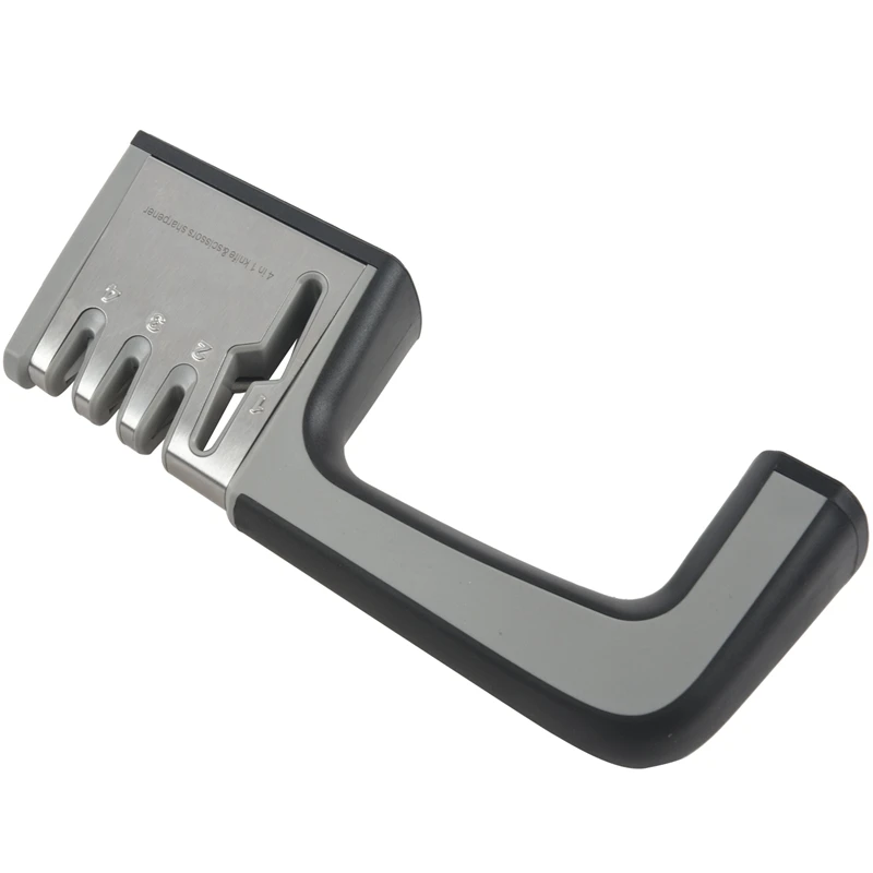 Новейший дизайн 4 в 1 точилка для ножей и ножниц: подходит для всех бытовых ножей. Есть даже канавки для ножниц, которые не могут быть заточены обычными ножами для заточки. Наличие одного из этих многофункциональных точилок может удовлетворить все ваши потребности в заточке. Слот 1 для шлифовки ножниц, слот 2 грубого помола для тусклых металлических ножей, слот 3 среднего помола для ежедневного использования или керамических ножей, слот 4 тонкого помола для отделки и полировки краев.