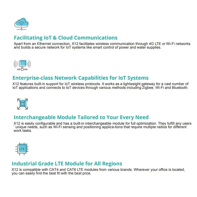 X12 создает беспроводную связь через сети 4G LTE или WiFi и создает безопасную сеть для таких систем, как умное управление питанием и водными ресурсами. Поддерживает беспроводные протоколы loT, работает как легкий шлюз для большого количества приложений.