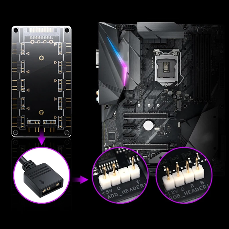 1. Роль этого концентратора заключается в том, чтобы расширить программируемый интерфейс RGB 3-pin 5 V на материнской плате и подключить больше полос или 5 V streamer вентиляторов для унифицированного затемнения материнской платы.