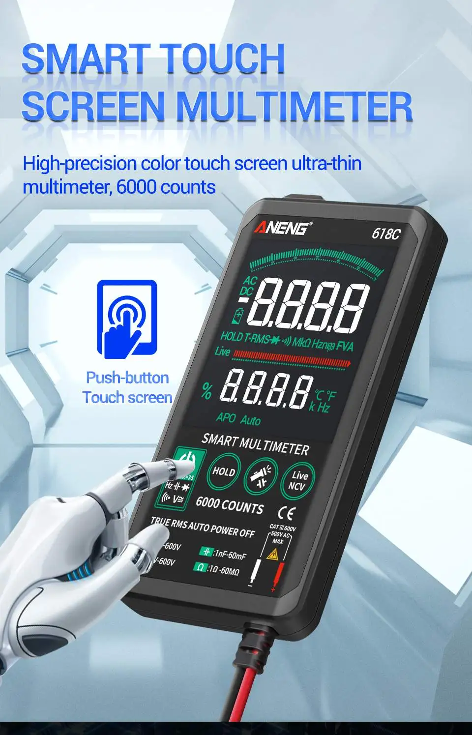 Функция 618A 618B 618C Экран Обычный ЖК-дисплей Экран VA Цвет Scrren Напряжение постоянного тока DCV √ √ √ Переменное напряжение ACV √ √ √ Резистор √ √ √ Диод/испытание ВКЛ-ВЫКЛ/конденсатор √ √ √ Частота F √ √ √ Сенсорный ключ √ √ √ Непрерывная работа электропитания √ √ √ NCV √ √ √ Тест на нулевую линию/пожарную линию √ √ √ Символ полного блока √ √ √ Подсветка ручная/автоматическое выключение √ √ √ Истинное измерение RMS √ √ √ Температура (℃/℉) √ √ √ Освещение фонарика √ √ √ Диапазон Точность DCV / ACV 6 в/60 в/600 В ±(0.5% + 3) DCV / ACV DC1000V/AC750V ±(0.8% + 10) Сопротивление 600Ω ±(0.8% + 5) 6k Ω/60k Ω/600k Ω/6MΩ ±(0.8% + 3) 60 МОм ±(2.5% + 3) Емкость 10nF/100nF /1 мкФ/10 мкФ/100 мкФ/1mF/10mF ±(3.5% + 20) 60mF ±(5% + 3) Частота 10 Гц/100 Гц/1 кГц/10 кГц/100 кГц/1 МГц/10 МГц (только 618C) ±(0.1% + 3)