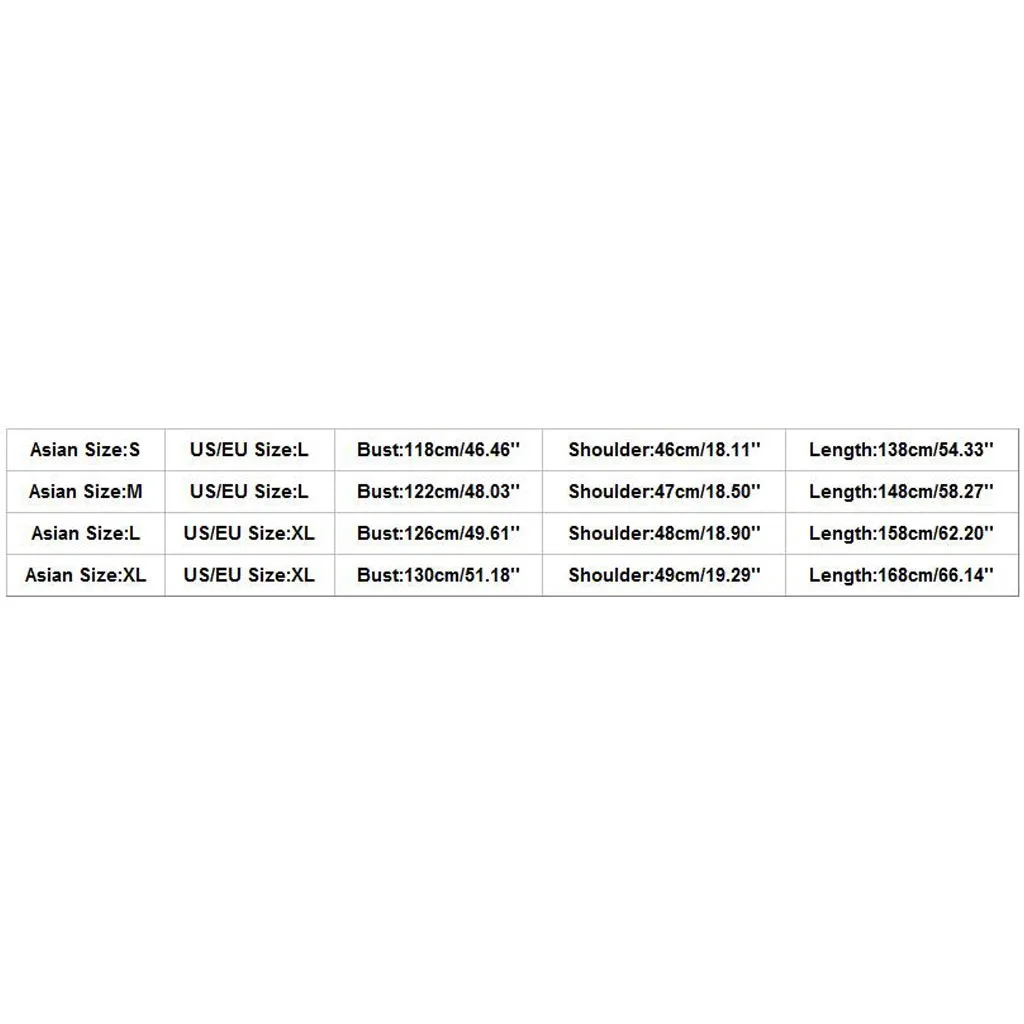 Азиатский размер Размер США/ЕС Бюст Плечо Длина S L 118 см/46,46'' 46 см/18,11'' 138 см/54,33'' М L 122 см/48,03'' 47 см/18,50'' 148 см/58,27'' L XL 126 см/49,61'' 48 см/18,90'' 158 см/62,20'' XL XL 130 см/51,18'' 49 см/19,29'' 168 см/66,14''