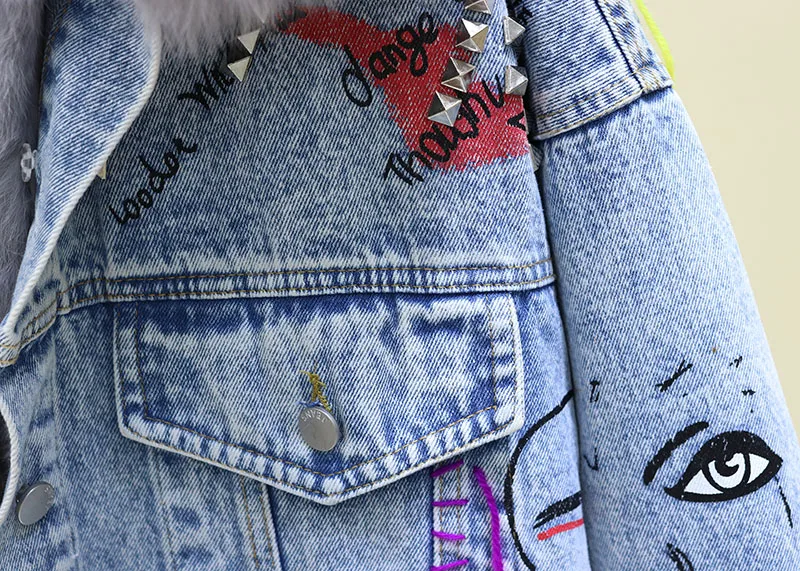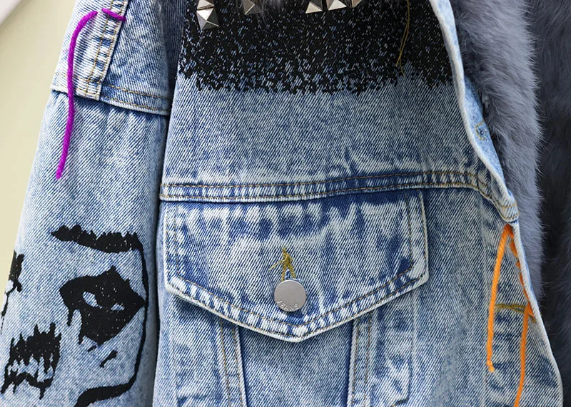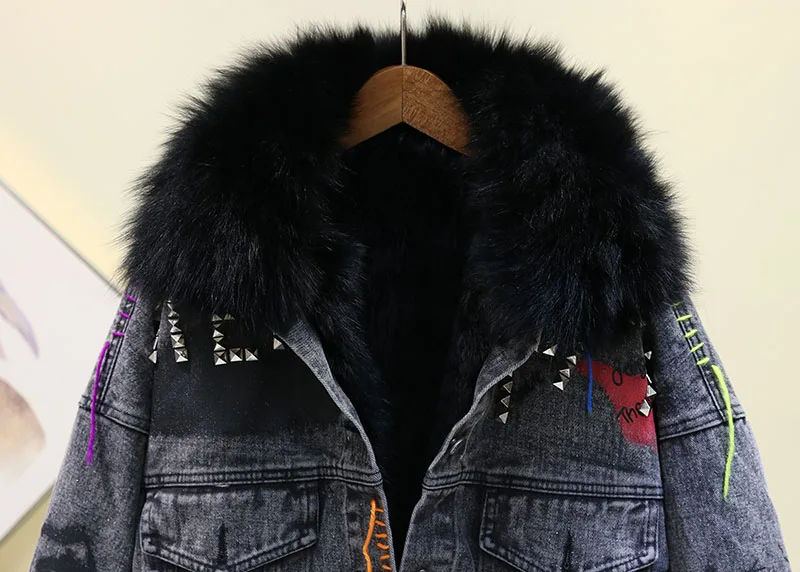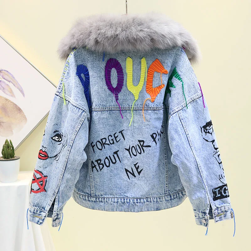 Зимняя женская куртка с натуральным меховым воротником и подкладкой из кроличьего меха, джинсовая куртка, Женское пальто, толстые джинсы с рисунком «граффити», женская уличная куртка Размеры (см)Обхват грудиДлинаРукаваСумка на плечоОбхват талииОбхват бедер Универсальный Размер XS S М1065053 L1105154 XL 2XL 3XL 4XL 5XL 6XL 7XL