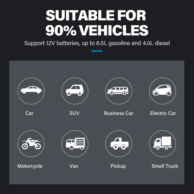 Может пусковое устройство автомобилей с напряжением 12 В, грузовых автомобилей, автофургонов, пикапы, квадроциклов, внедорожников, косилок, яхты, мотоциклы, снегоход, водный транспорт или лодки до 15 раз при полном заряде. Он может служить в качестве компактного внешнего аккумулятора с емкостью 12800 мАч, который может поставить двойную зарядку USB и другие автомобильные аксессуары через порт постоянного тока 12V 10A.