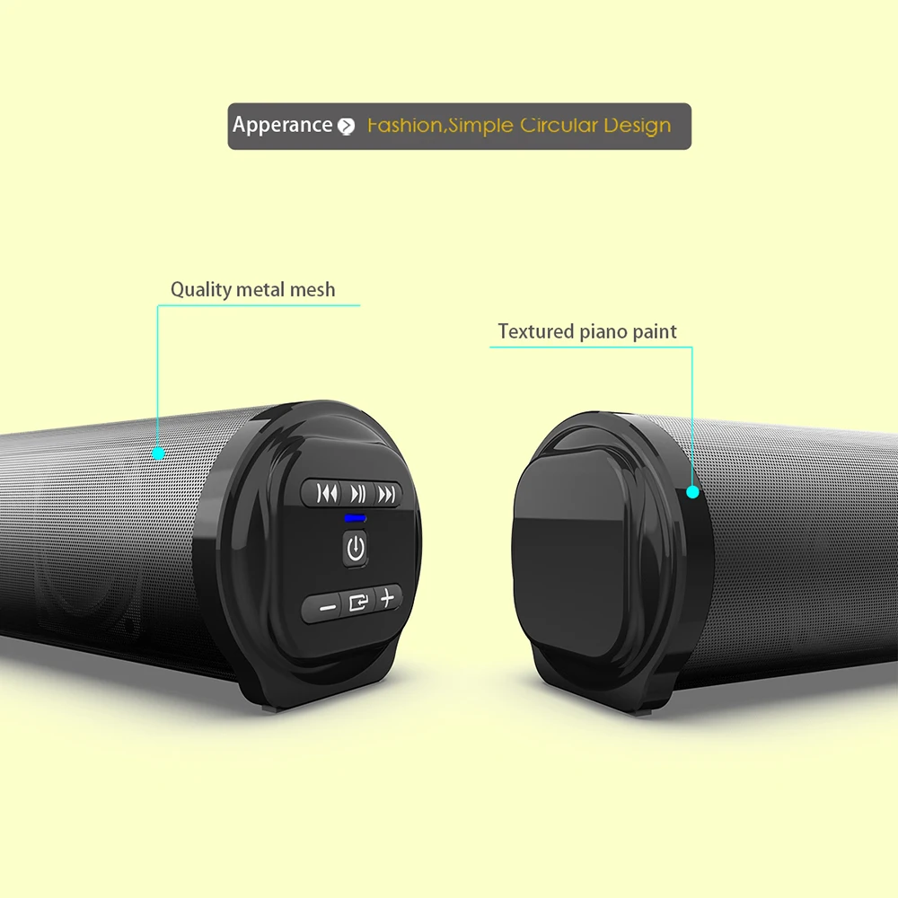 Канал: 2,0 1. Версия Bluetooth: V5.0 2. Динамик: 5 Вт * 4 3. Расстояние Bluetooth: 10 м 4. Емкость аккумулятора: 2000 ма 3,7 В 5. Номинальное напряжение: 5 В постоянного тока 6. Время воспроизведения музыки: около 3 часов. 7. Время работы в режиме ожидания: 240 часов. 8. 1 а Время зарядки: около 2 часов. 9. Аудио вход: Bluetooth,RCA, 3,5 мм Aux, tf-карта , USB 10. Размер: 550x50x50 мм/ 21,65 дюйма x 1,97 дюйма x 1,97 дюйма 11. Вес нетто: 585 г 12. Fm-радио частота: 87,5-108 13. Аксессуары: зарядный кабель, Кабель 3,5 мм-RCA, пульт дистанционного управления, Руководство по эксплуатации 14. Поддержка Телевизор/ПК/телефон/планшет/ноутбук/MP3/M P4/dvd-плеер/ТВ-приставка аудио