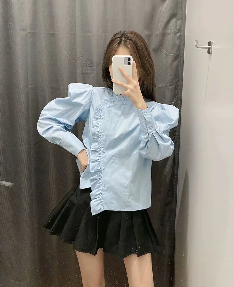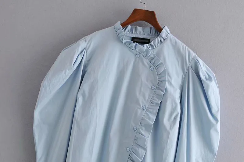 Весна-лето 2020, женские синие рубашки с рюшами, однотонные элегантные офисные блузки с длинным рукавом