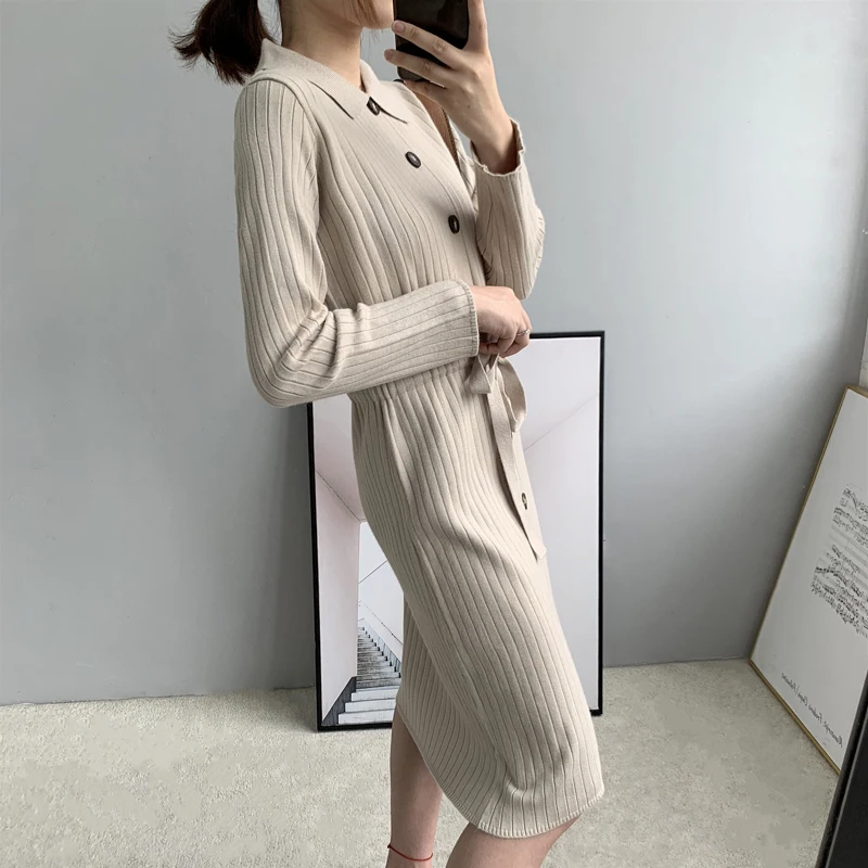 Зимнее платье, женское платье-свитер средней длины, Осеннее модное шерстяное платье на пуговицах с длинным рукавом, вязаное женское облегающее платье черного цвета