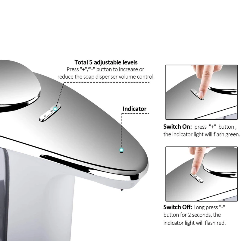 [5 уровней регулируемого объема жидкого мыла] дозатор жидкого мыла поставляется с 5 различными настройками для регулировки количества мыла, которое вы хотите распределить. Без капель или отработанного мыла. Также очень удобно переключать эту автоматическую функцию, нажав кнопку «+», чтобы включить ее и кнопку «-» в течение 2 секунд, чтобы выключить ее. Просто нажмите «+» или «-» один раз, чтобы увеличить или уменьшить на один уровень.
